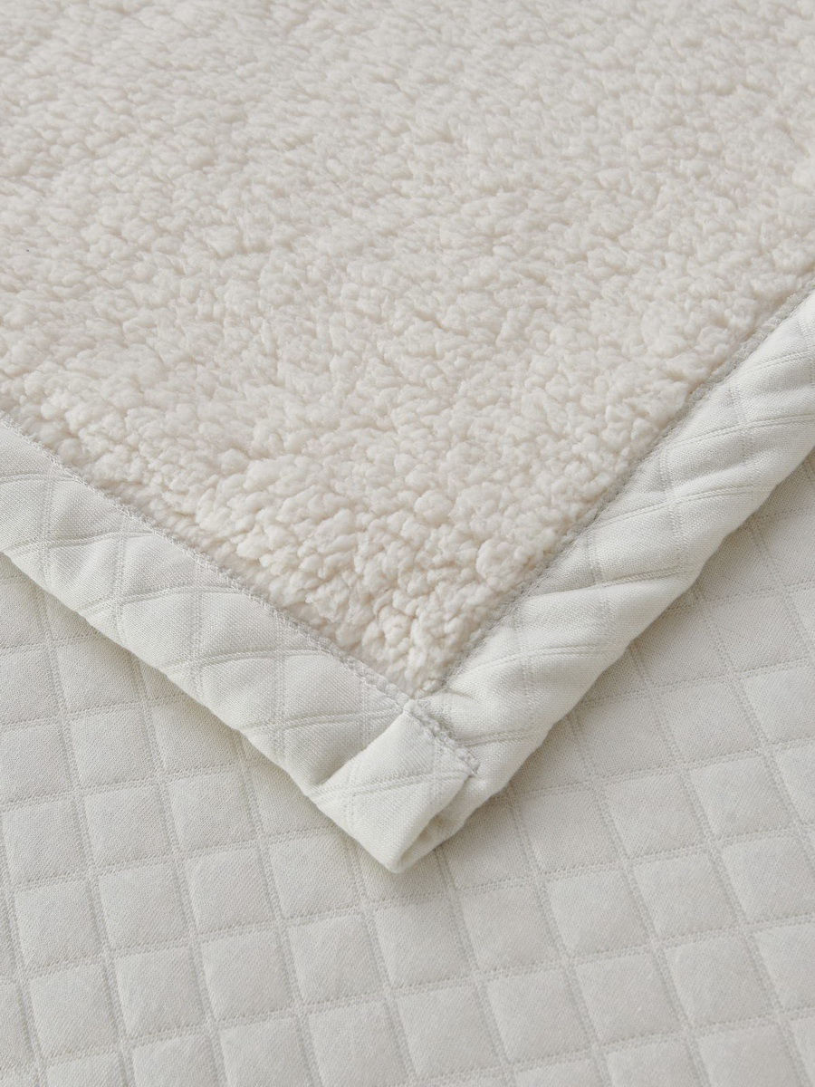 Плед трикотажный с ромбовидным рисунком. Лицевая сторона - трикотаж , низ - искусственный мех. Упаковка: текстильная сумка. Состав: вискоза 100%