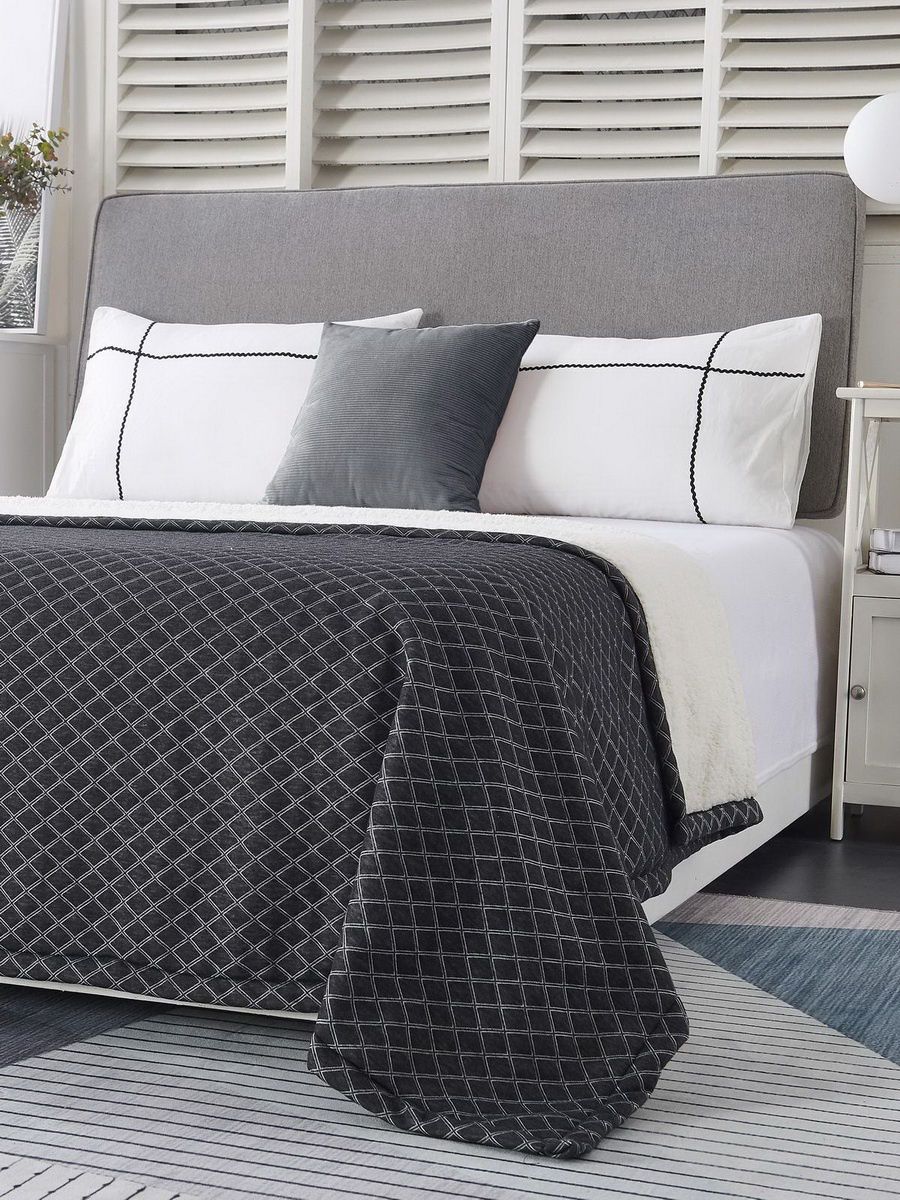 Плед трикотажный с ромбовидным рисунком. Лицевая сторона - трикотаж , низ - искусственный мех. Упаковка: текстильная сумка. Состав: вискоза 100%