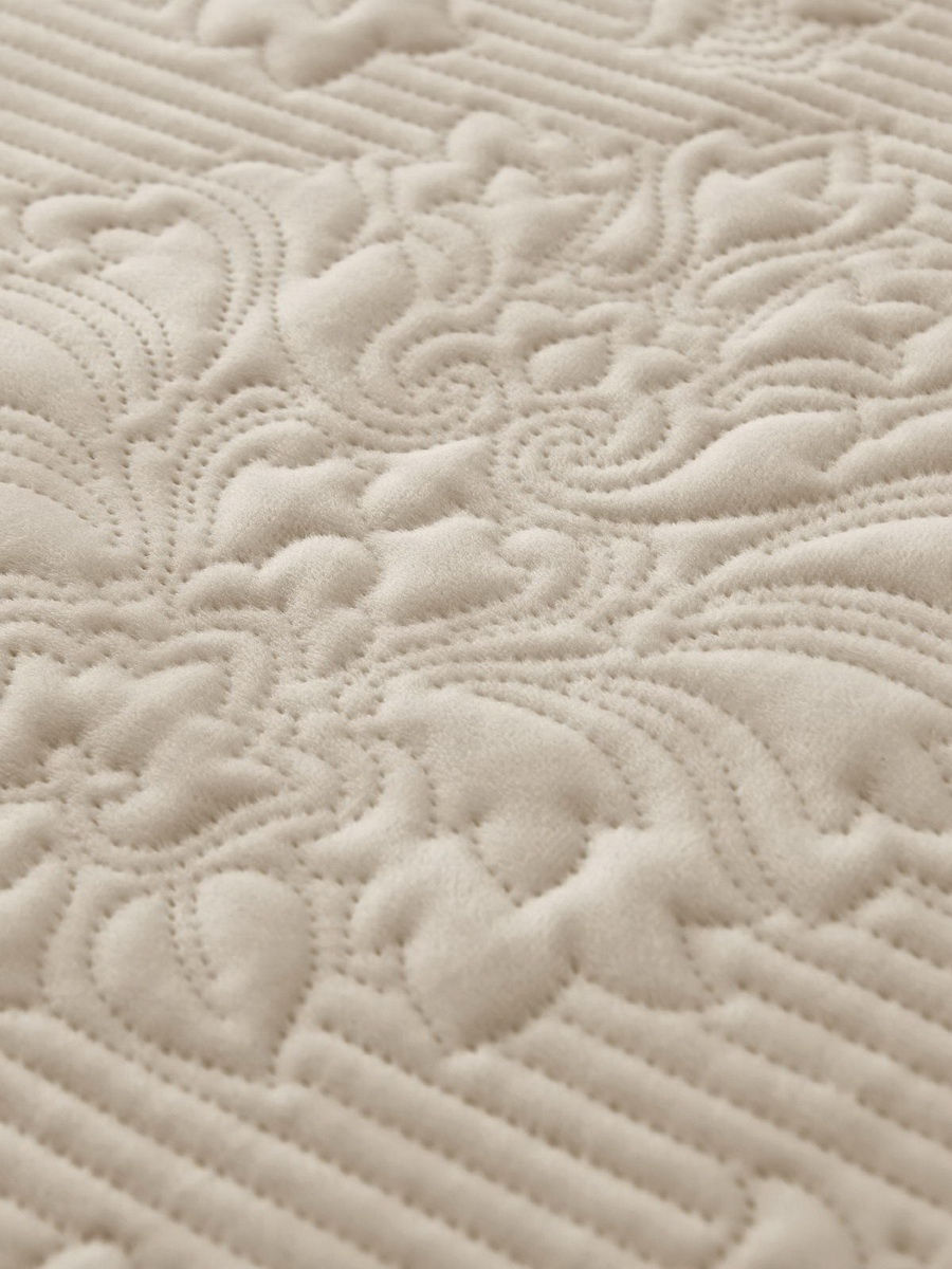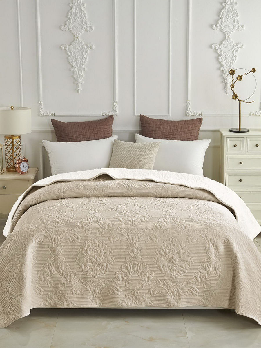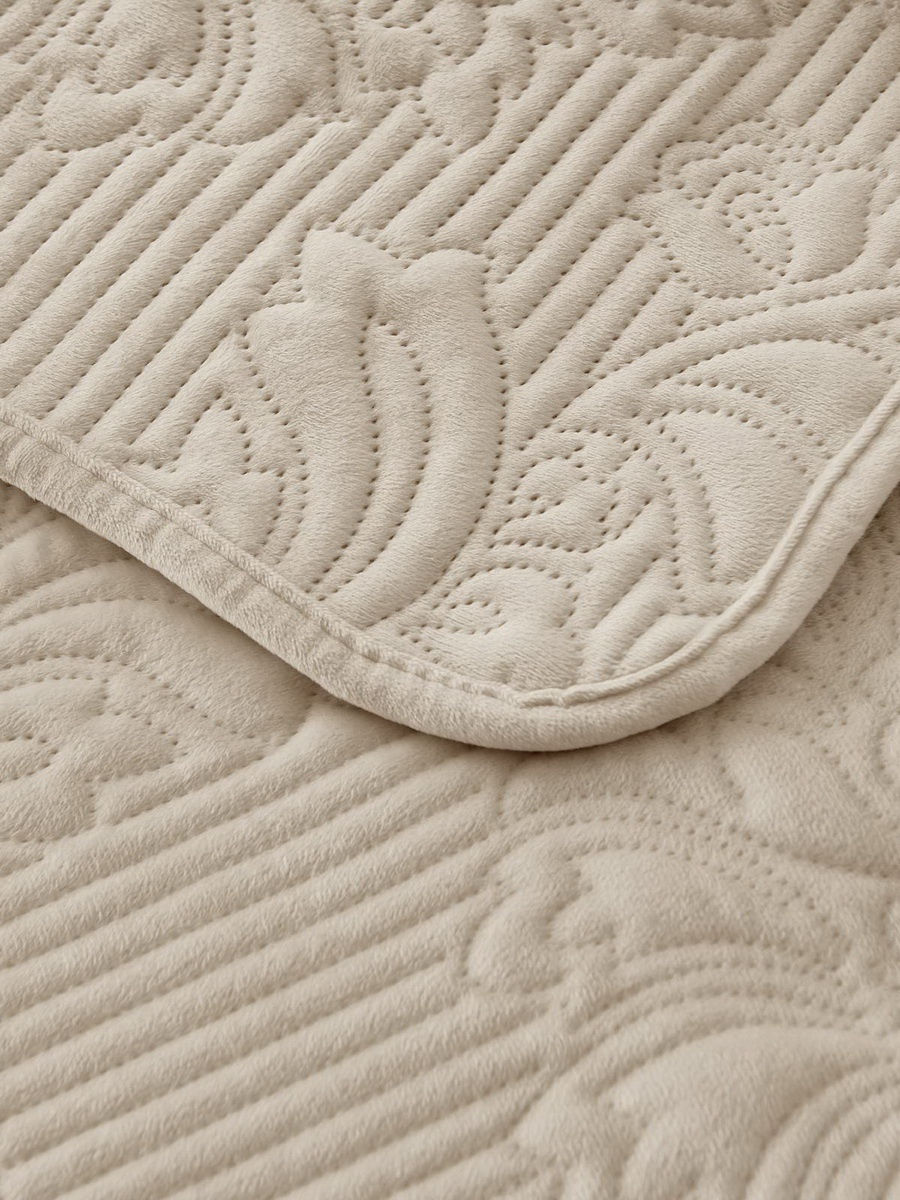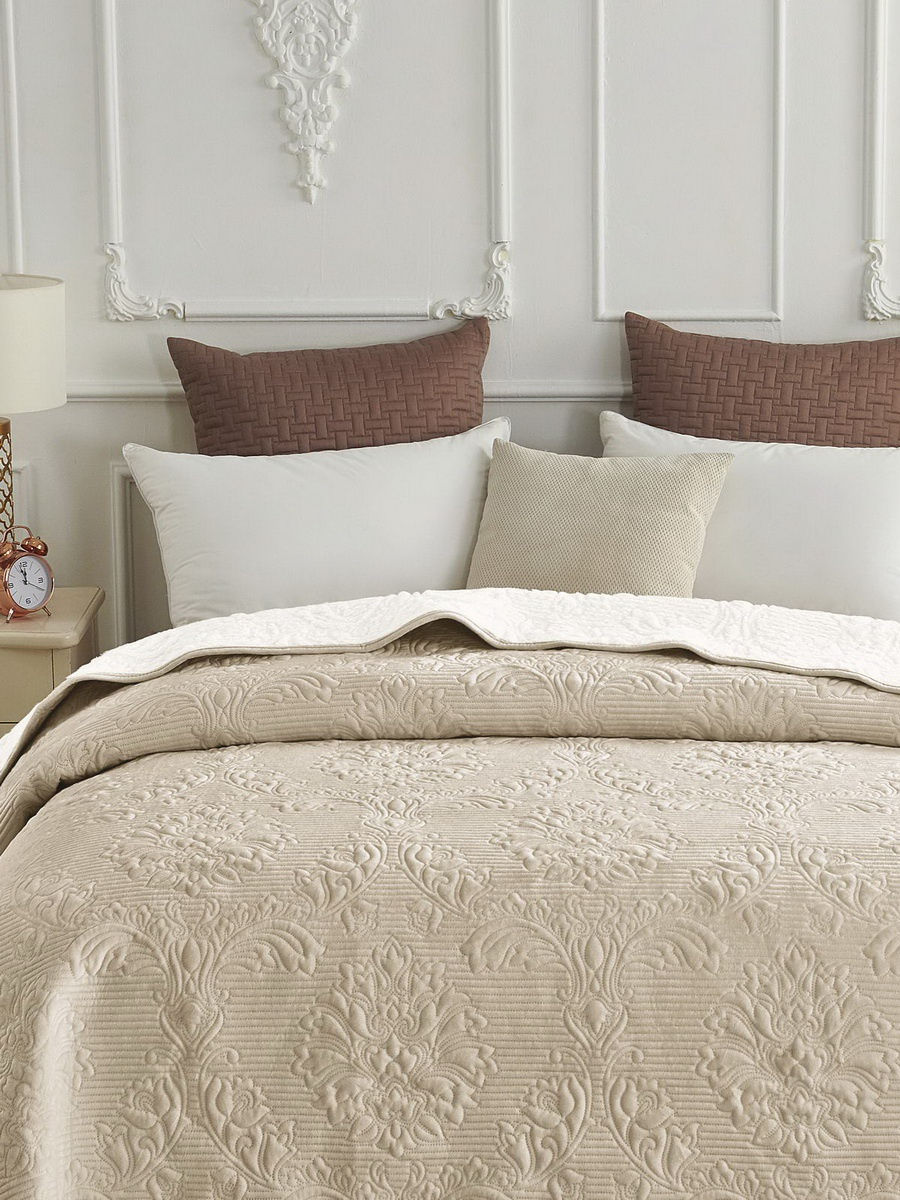 Плед-покрывало двустороннее: лицевая сторона выполнена из велюра с термостежкой в виде рисунка \"дамаск\", обратная сторона-имитация меха. Уход: стирка при 30 гр. Состав: хлопок, вискоза