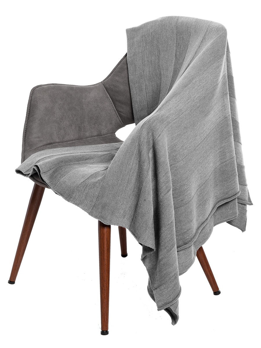 Минималистичный плед фактурной вязки из меланжевой пряжи. Плед перевязан декоративной вязаной лентой. Состав: акрил 100%