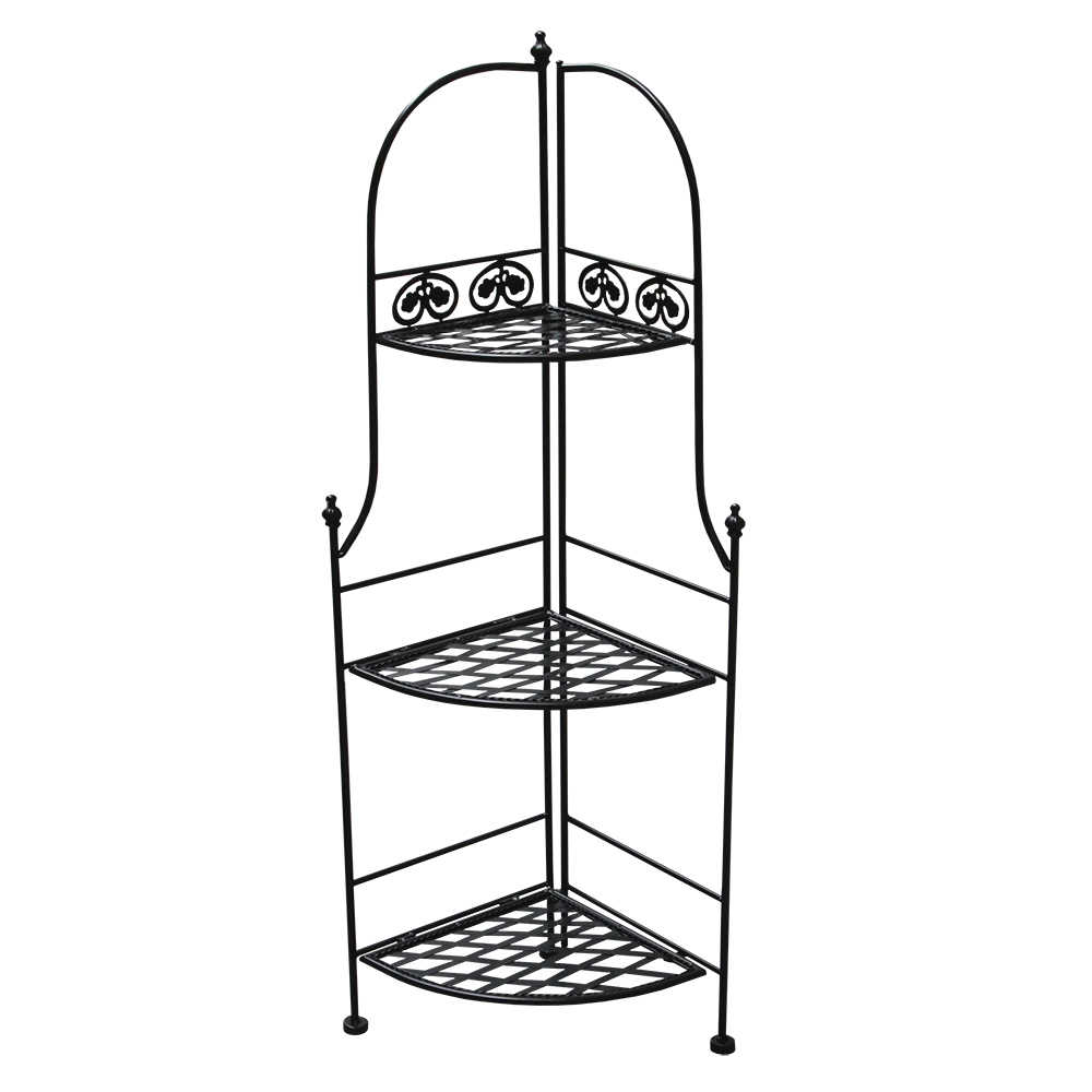 Напольная подставка для цветов. Применяется для размещения горшков с растениями, хранения небольших хозяйственных и бытовых предметов. Конструкция выполнена из металла в черном цвете, покрыта специальным антикоррозийным составом, надежна и проста в уходе, безопасна в использовании. Оснащена тремя полками, украшена декоративными коваными элементами. Изделие имеет устойчивую конструкцию. Поможет организовать пространство как в комнате, так и на открытой веранде.
