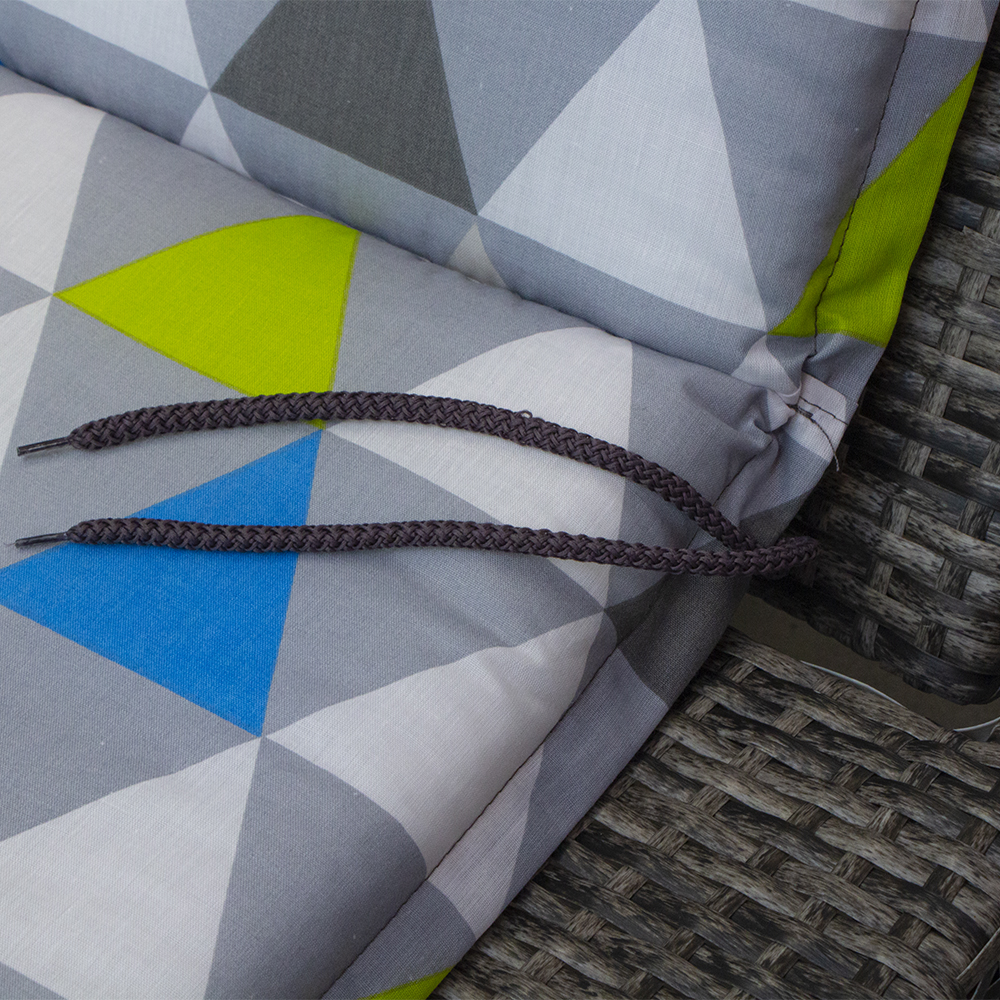 Подушка используется для создания дополнительного комфорта при посадке на твердую поверхность. Сиденье выполнено из прочной ткани с синтетическим наполнителем. Декорировано принтом в виде треугольников разного цвета. Для надежной фиксации оснащено завязками. Уход: машинная стирка при температуре не более 30°C, не отбеливать, химчистка запрещена.