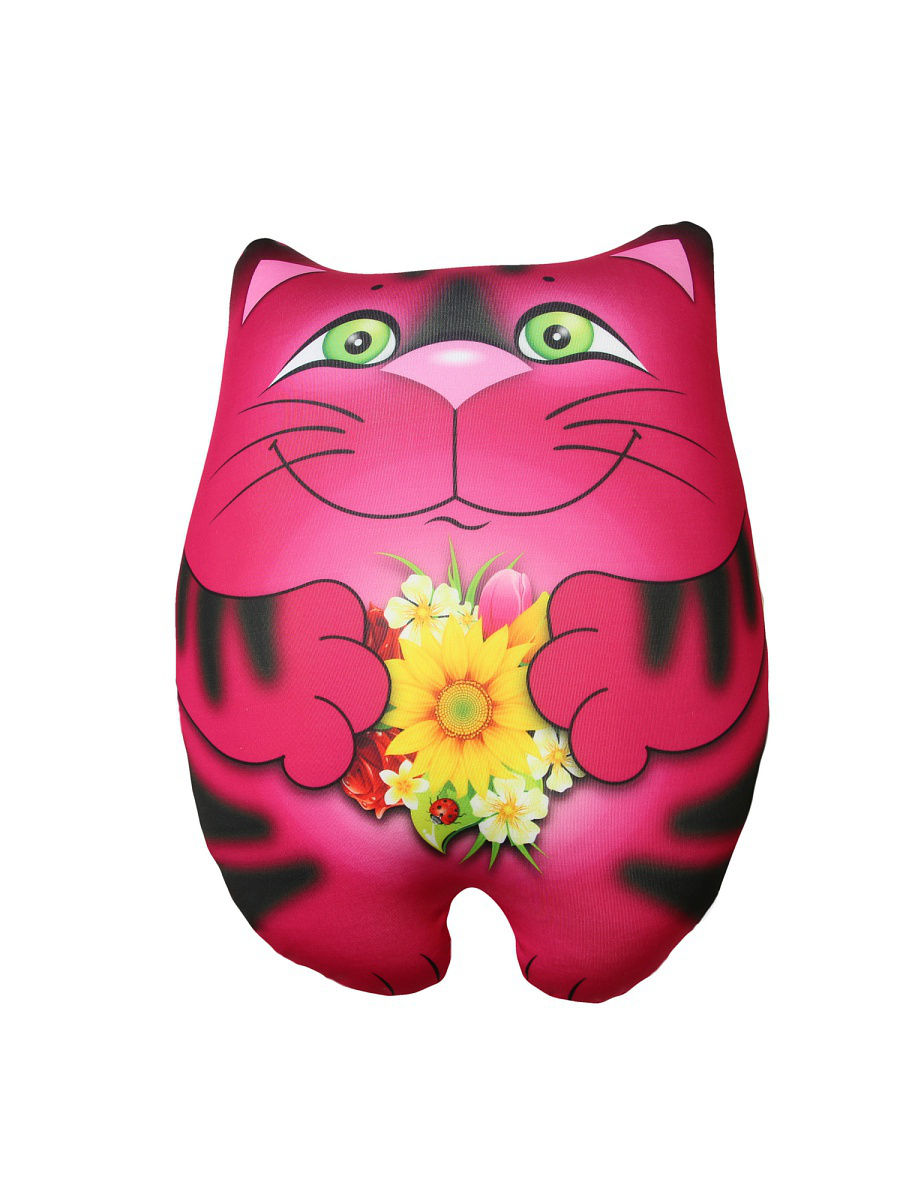 Среди самых ласковых прозвищ, которыми мы награждаем своих близких и родных, \"котик\", наверное, самое популярное. Он-самый милый, добрый и заботливый. И главное, котик никогда не сомневается, какой подарок выбрать. Поручите ему это сложное дело-и он справится на \"отлично\". Первым делом, конечно, цветы. Вот он, Кот с цветами, улыбающийся и спокойный. Он знает, что выбрал самые любимые. А еще в любом подарке главное-это слова, искренние, нежные, идущие от сердца. Можно сделать подарок с сюрпризом, и тогда понадобится красивая коробочка, перевязанная яркой лентой или бантом. В любом случае, сам Кот становится очаровательным подарком. Размер подушки-игрушки: 33х25 см. Состав: полиэстер, полистирол