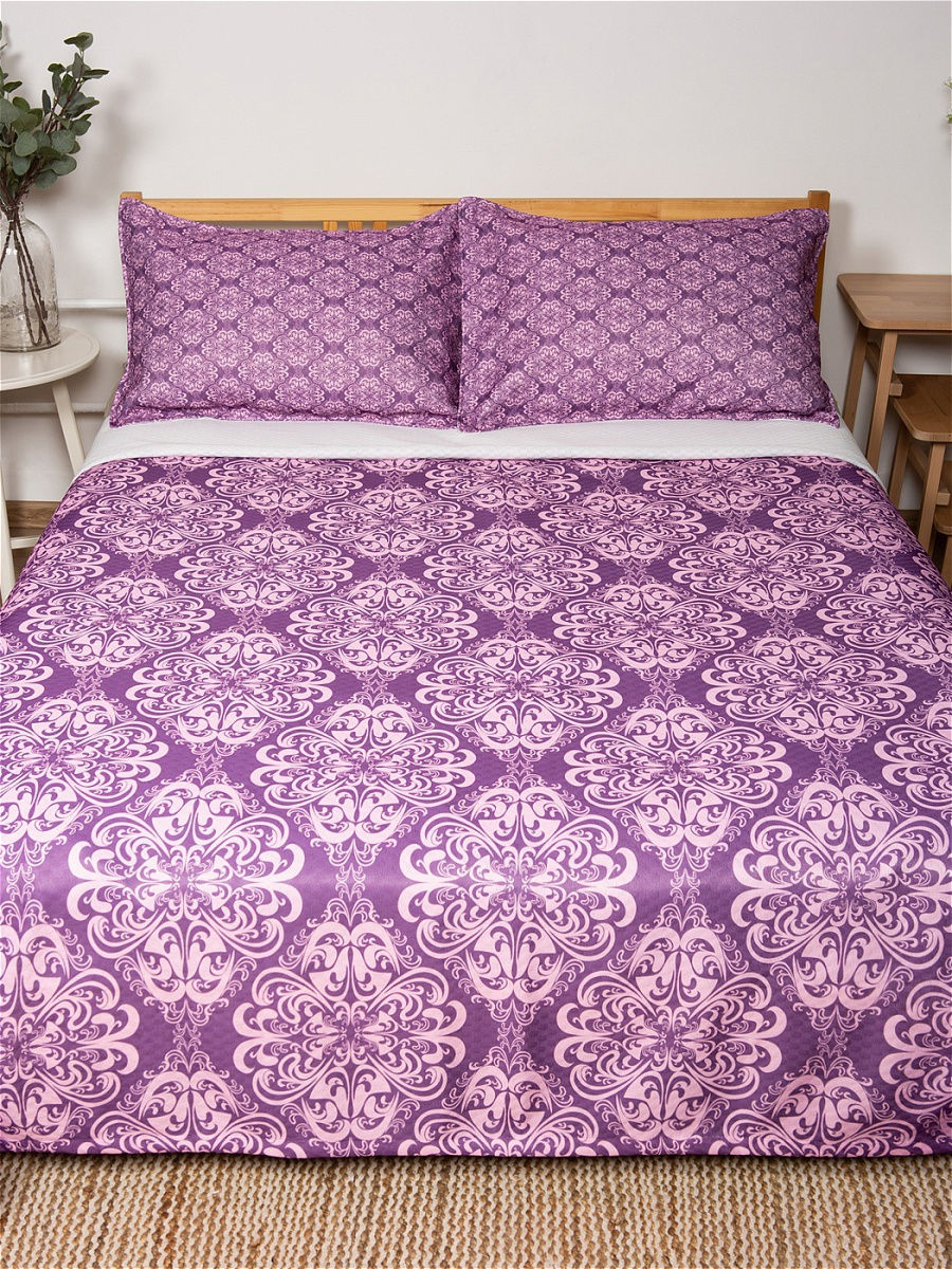 Комплект покрывала с наволочками \"Глория\" из стеганого трикотажа с плетением жаккард. Размер Евро: 220x235 см покрывало, 50x70 см наволочки. В комплекте покрывало-плед и 2 наволочки. Материал изделий особо мягкий, \"дышащий\", ощущается как хлопок. Он состоит из трех слоев: два слоя плотной ткани с плетением жаккард, а между ними проложен теплый и легкий гиппоаллергенный тонкий наполнитель из синтепона. Покрывало функциональное, может использоваться как одеяло. Не сползает с кровати, края спадают равномерно, закрывая бока. Стежки \"соты\" создают интересный выпуклый узор, который делает покрывало и наволочки рельефными, придавая особую элегантность. Лицевая часть покрывала и наволочек с фотопечатью, оборотная - белая. Изделия сохранят форму даже после многочисленных стирок. Дизайн: \"узоры, орнамент, классика\". Цвета: \"фиолетовый, сиреневый\". Состав: полиэстер 100%