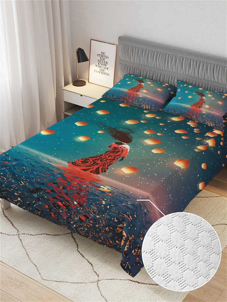 Комплект покрывала с наволочками \"Морской призрак\" из стеганого трикотажа с плетением жаккард. Размер Евро: 220x235 см покрывало, 50x70 см наволочки. В комплекте покрывало-плед и 2 наволочки. Материал изделий особо мягкий, \"дышащий\", ощущается как хлопок. Он состоит из трех слоев: два слоя плотной ткани с плетением жаккард, а между ними проложен теплый и легкий гиппоаллергенный тонкий наполнитель из синтепона. Покрывало функциональное, может использоваться как одеяло. Не сползает с кровати, края спадают равномерно, закрывая бока. Стежки \"соты\" создают интересный выпуклый узор, который делает покрывало и наволочки рельефными, придавая особую элегантность. Лицевая часть покрывала и наволочек с фотопечатью, оборотная - белая. Изделия сохранят форму даже после многочисленных стирок. Дизайн: \"девушка, река, платье\". Цвета: \"белый, черный, серый\". Состав: полиэстер 100%