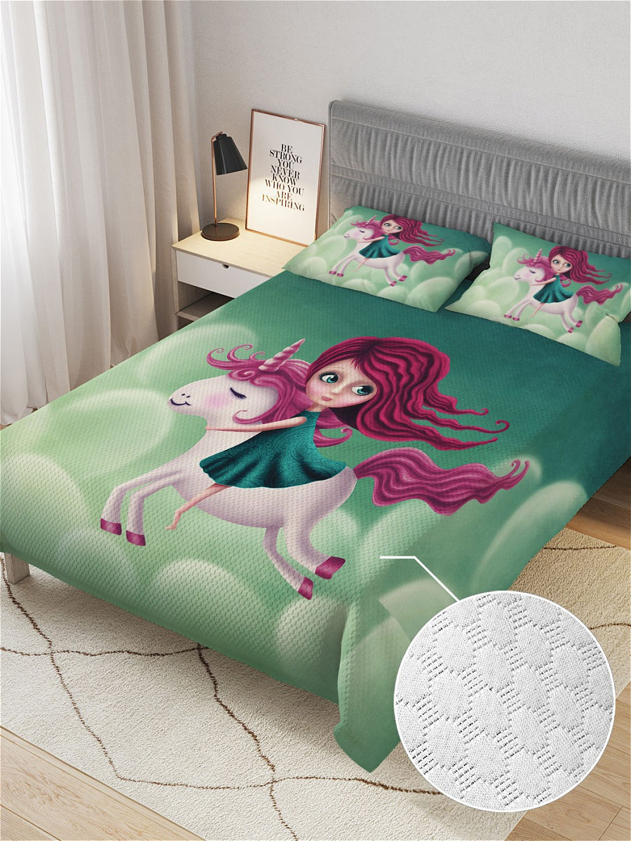 Комплектация: покрывало и 2 наволочки из стеганого трикотажа со стежкой \"соты\" . Материал: высокотехнологичное трикотажное полотно с прослойкой синтепона. Покрывало \"Полет на верном единорожке\" - теплое, объемное и при этом чрезвычайно легкое по весу, не только украсит ваш дом, но и согреет в холодные дни. Трехслойное покрывало состоит из двух внешних жаккардовых слоев и внутреннего, утепленного нитками синтепона. Благодаря используемым материалам покрывало не мнется, имеет высокую износостойкость и долговечность. Изделие порадует не только своей декоративностью, но и функциональностью. Покрывало прекрасно ложиться на кровать, равномерно спадая по бокам. Внутренний слой из ниток синтепона делает его \"дышащим\" и теплым, позволяя использовать как одеяло. Наружные жаккардовые слои приятны к телу. Покрывало по ощущениям напоминает хлопок. Лицевая часть стеганого покрывала с фотопечатью, оборотная - белая. На рисунке: единорог, девочка, девочка скачет на единороге. Состав: полиэстер 100%