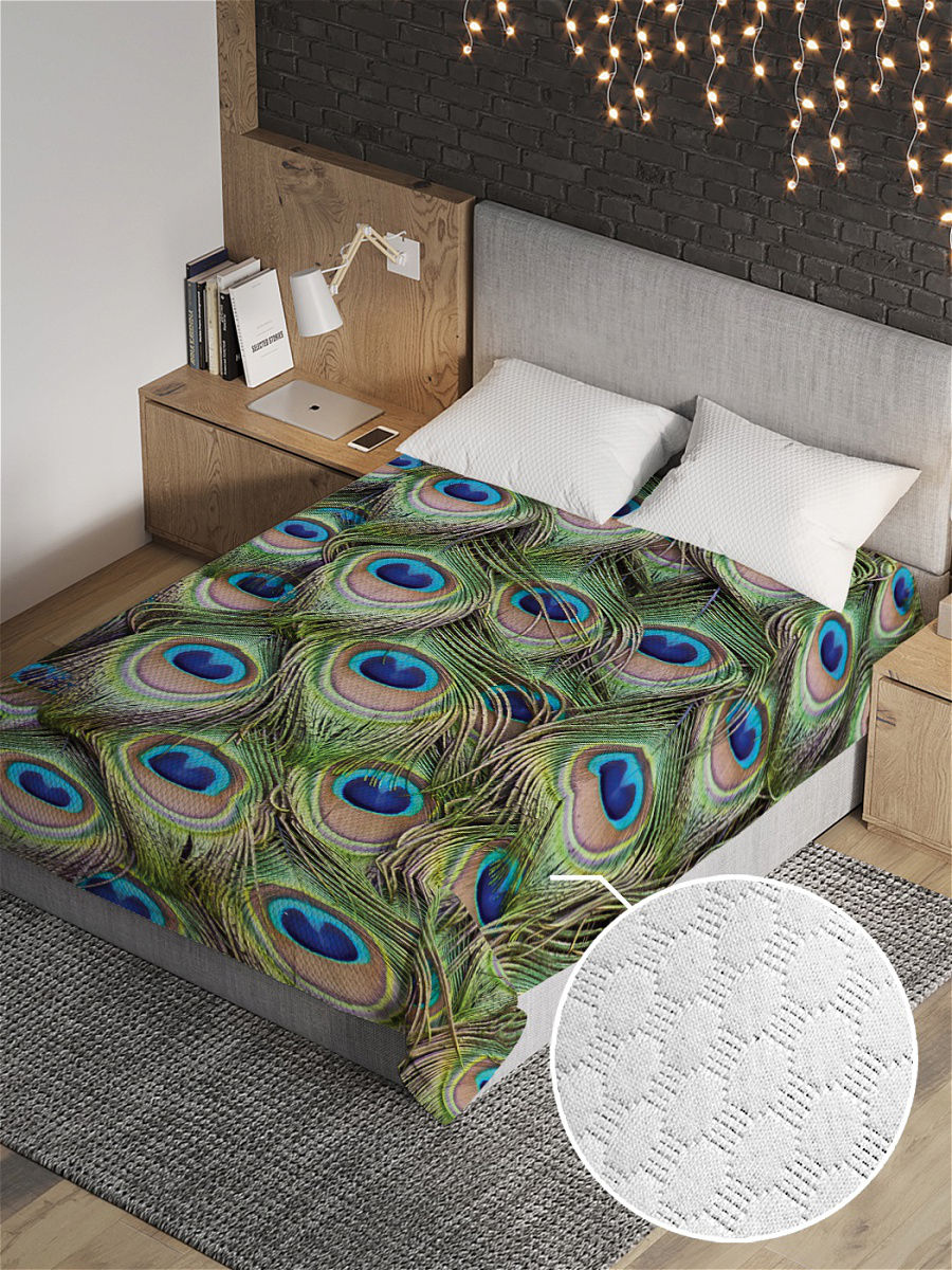 Комплектация: стеганое покрывало. Размер: 220x235 см. Материал: стеганый трикотаж. Дизайн: перья,узор,круги. Практичное, красивое и приятное на ощупь стеганое покрывало \"Павлиний мир\" станет модным аксессуаром для спальни, при необходимости заменит одеяло. Материал покрывала состоит из трех слоев: два слоя плотной ткани с плетением жаккард, а между ними проложен теплый и легкий гиппоаллергенный тонкий наполнитель из синтепона. Основные цвета покрывала: синий,зеленый,серый. Покрывало сохраняет форму даже после многочисленных стирок. Стежки создают интересный выпуклый узор, который делает изделие рельефным и придает ему особую элегантность. Стеганое покрывало легко и быстро преобразит интерьер в стиле \"Павлиний мир\". Метод сублимационной печати, используемый для создания изображения, гарантирует сохранение рисунка долгие годы без выцветания. Состав: полиэстер 100%