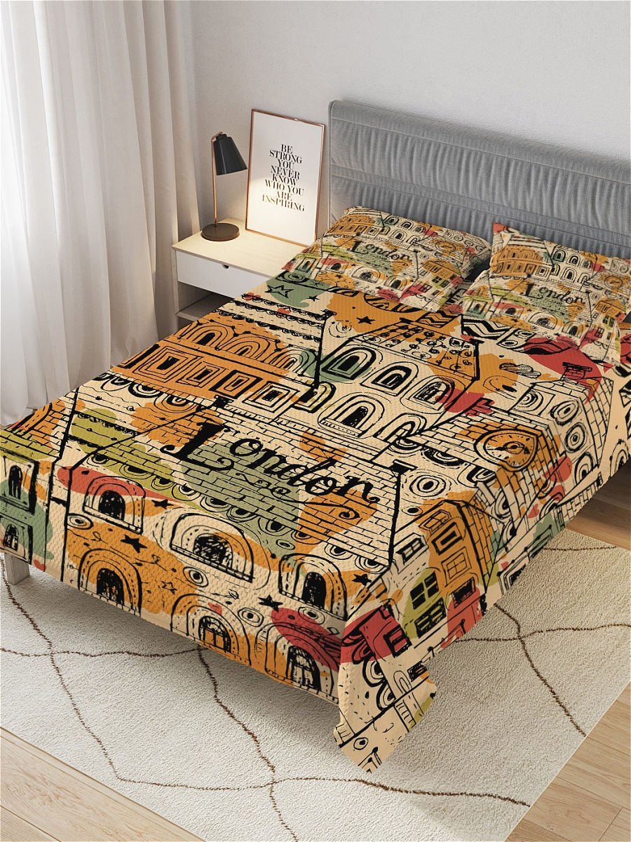 Комплектация: покрывало и 2 наволочки. Размер: покрывало - 160х220 см (1,5-спальное), наволочки 50х70 см. Материал: высокотехнологичное трикотажное жаккардовое полотно с прослойкой синтепона. Покрывало - теплое, объемное и при этом чрезвычайно легкое по весу, не только украсит ваш дом, но и согреет в холодные дни. Трехслойное покрывало состоит из двух внешних жаккардовых слоев и внутреннего, утепленного нитками синтепона. Благодаря используемым материалам покрывало не мнется, имеет высокую износостойкость и долговечность. Изделие порадует не только своей декоративностью, но и функциональностью. Покрывало прекрасно ложиться на кровать, равномерно спадая по бокам. Внутренний слой из ниток синтепона делает его \"дышащим\" и теплым, позволяя использовать как одеяло. Наружные жаккардовые слои приятны к телу. Покрывало по ощущениям напоминает хлопок. Лицевая часть стеганого покрывала с фотопечатью, оборотная - белая. Состав: полиэстер 100%