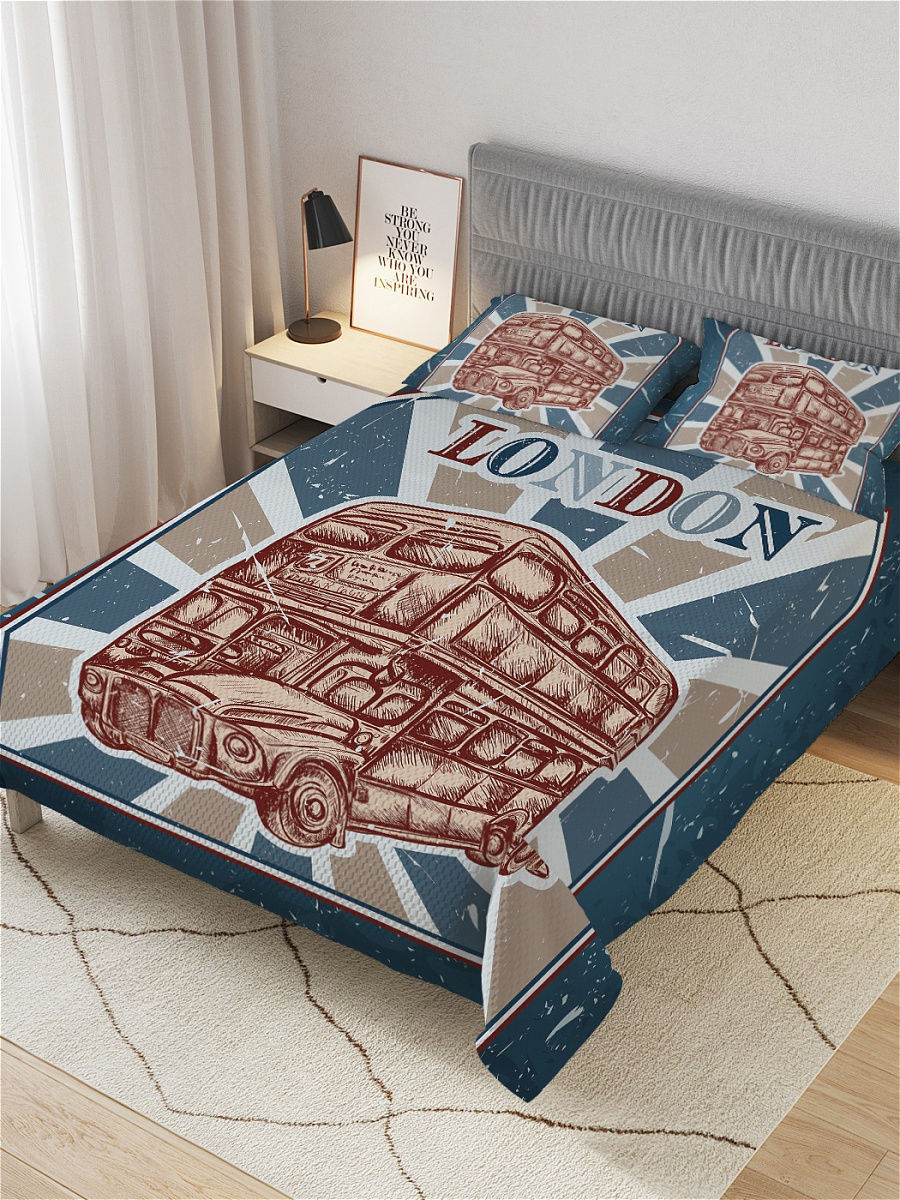 Комплектация: покрывало и 2 наволочки. Размер: покрывало - 160х220 см (1,5-спальное), наволочки 50х70 см. Материал: высокотехнологичное трикотажное жаккардовое полотно с прослойкой синтепона. Покрывало - теплое, объемное и при этом чрезвычайно легкое по весу, не только украсит ваш дом, но и согреет в холодные дни. Трехслойное покрывало состоит из двух внешних жаккардовых слоев и внутреннего, утепленного нитками синтепона. Благодаря используемым материалам покрывало не мнется, имеет высокую износостойкость и долговечность. Изделие порадует не только своей декоративностью, но и функциональностью. Покрывало прекрасно ложиться на кровать, равномерно спадая по бокам. Внутренний слой из ниток синтепона делает его \"дышащим\" и теплым, позволяя использовать как одеяло. Наружные жаккардовые слои приятны к телу. Покрывало по ощущениям напоминает хлопок. Лицевая часть стеганого покрывала с фотопечатью, оборотная - белая. Состав: полиэстер 100%
