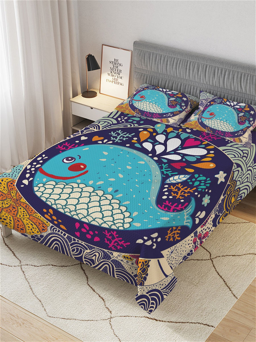 Комплектация: покрывало и 2 наволочки. Размер: покрывало - 160х220 см (1,5-спальное), наволочки 50х70 см. Материал: высокотехнологичное трикотажное жаккардовое полотно с прослойкой синтепона. Покрывало - теплое, объемное и при этом чрезвычайно легкое по весу, не только украсит ваш дом, но и согреет в холодные дни. Трехслойное покрывало состоит из двух внешних жаккардовых слоев и внутреннего, утепленного нитками синтепона. Благодаря используемым материалам покрывало не мнется, имеет высокую износостойкость и долговечность. Изделие порадует не только своей декоративностью, но и функциональностью. Покрывало прекрасно ложиться на кровать, равномерно спадая по бокам. Внутренний слой из ниток синтепона делает его \"дышащим\" и теплым, позволяя использовать как одеяло. Наружные жаккардовые слои приятны к телу. Покрывало по ощущениям напоминает хлопок. Лицевая часть стеганого покрывала с фотопечатью, оборотная - белая. Состав: полиэстер 100%