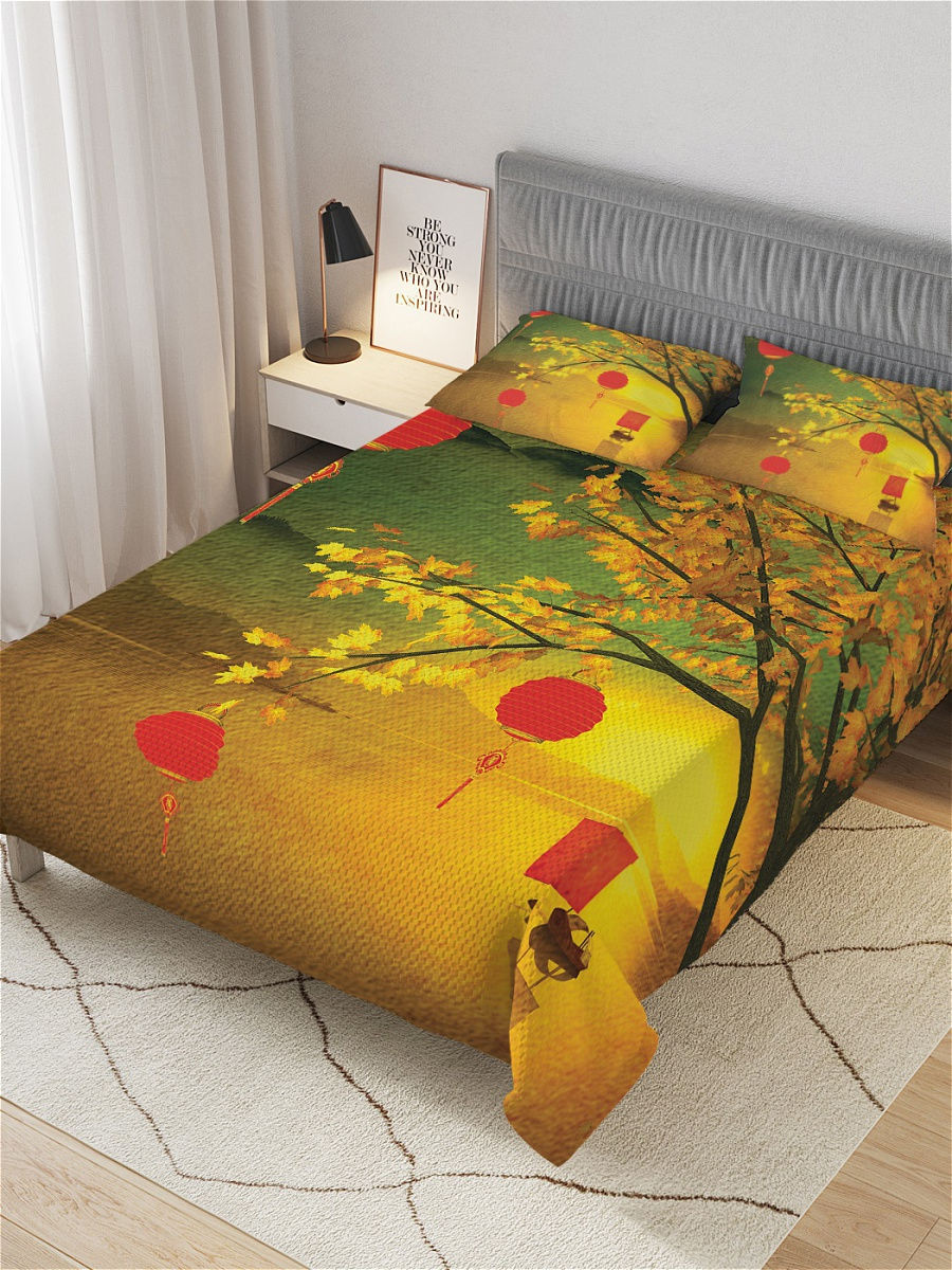 Комплект покрывала с наволочками из стеганого трикотажа с плетением жаккард. Размер Евро: покрывало 220x235 см, наволочки - 50x70 см. В комплекте покрывало-плед и 2 наволочки. Материал изделий особо мягкий, \"дышащий\", ощущается как хлопок. Он состоит из трех слоев: два слоя плотной ткани с плетением жаккард, а между ними проложен теплый и легкий гиппоаллергенный тонкий наполнитель из синтепона. Покрывало функциональное, может использоваться как одеяло. Не сползает с кровати, края спадают равномерно, закрывая бока. Стежки создают интересный выпуклый узор, который делает покрывало и наволочки рельефными, придавая особую элегантность. Лицевая часть покрывала и наволочек с фотопечатью, оборотная - белая. Изделия сохранят форму даже после многочисленных стирок. Состав: полиэстер 100%