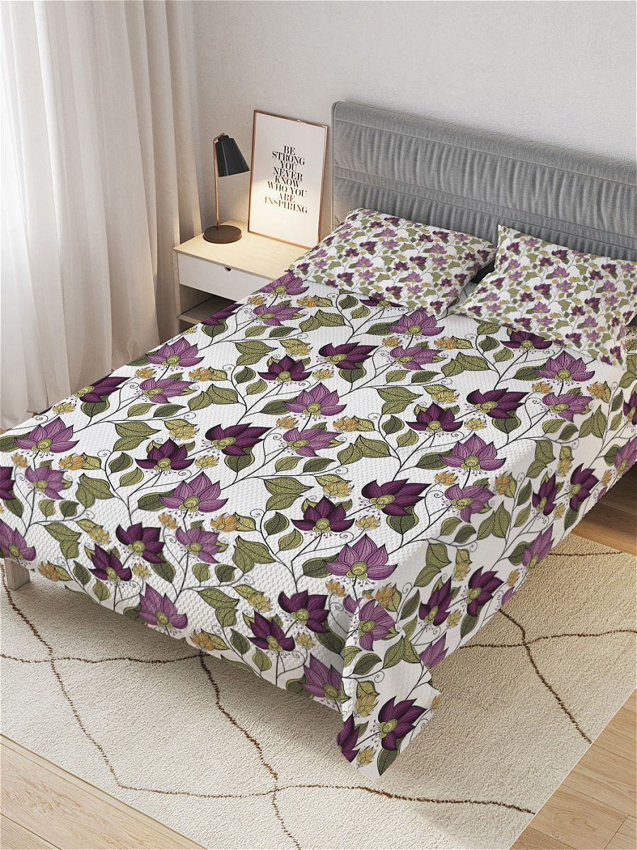 Комплект покрывала с наволочками из стеганого трикотажа с плетением жаккард. Размер Евро: покрывало 220x235 см, наволочки - 50x70 см. В комплекте покрывало-плед и 2 наволочки. Материал изделий особо мягкий, \"дышащий\", ощущается как хлопок. Он состоит из трех слоев: два слоя плотной ткани с плетением жаккард, а между ними проложен теплый и легкий гиппоаллергенный тонкий наполнитель из синтепона. Покрывало функциональное, может использоваться как одеяло. Не сползает с кровати, края спадают равномерно, закрывая бока. Стежки создают интересный выпуклый узор, который делает покрывало и наволочки рельефными, придавая особую элегантность. Лицевая часть покрывала и наволочек с фотопечатью, оборотная - белая. Изделия сохранят форму даже после многочисленных стирок. Состав: полиэстер 100%