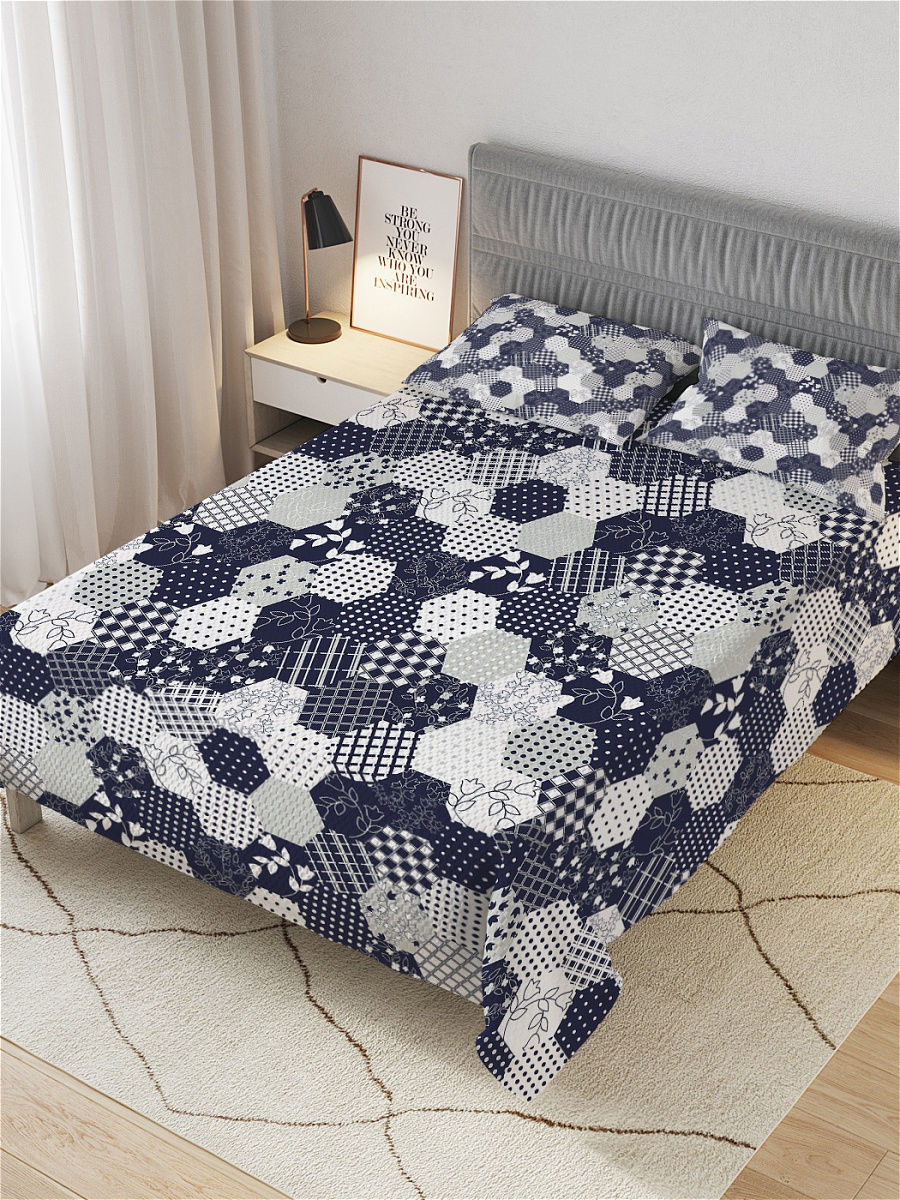 Комплект покрывала с наволочками из стеганого трикотажа с плетением жаккард. Размер Евро: покрывало 220x235 см, наволочки - 50x70 см. В комплекте покрывало-плед и 2 наволочки. Материал изделий особо мягкий, \"дышащий\", ощущается как хлопок. Он состоит из трех слоев: два слоя плотной ткани с плетением жаккард, а между ними проложен теплый и легкий гиппоаллергенный тонкий наполнитель из синтепона. Покрывало функциональное, может использоваться как одеяло. Не сползает с кровати, края спадают равномерно, закрывая бока. Стежки создают интересный выпуклый узор, который делает покрывало и наволочки рельефными, придавая особую элегантность. Лицевая часть покрывала и наволочек с фотопечатью, оборотная - белая. Изделия сохранят форму даже после многочисленных стирок. Состав: полиэстер 100%