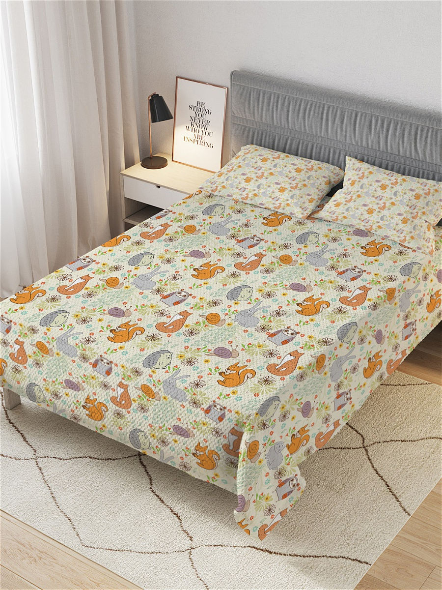 Комплект покрывала с наволочками из стеганого трикотажа с плетением жаккард. Размер Евро: покрывало 220x235 см, наволочки - 50x70 см. В комплекте покрывало-плед и 2 наволочки. Материал изделий особо мягкий, \"дышащий\", ощущается как хлопок. Он состоит из трех слоев: два слоя плотной ткани с плетением жаккард, а между ними проложен теплый и легкий гиппоаллергенный тонкий наполнитель из синтепона. Покрывало функциональное, может использоваться как одеяло. Не сползает с кровати, края спадают равномерно, закрывая бока. Стежки создают интересный выпуклый узор, который делает покрывало и наволочки рельефными, придавая особую элегантность. Лицевая часть покрывала и наволочек с фотопечатью, оборотная - белая. Изделия сохранят форму даже после многочисленных стирок. Состав: полиэстер 100%