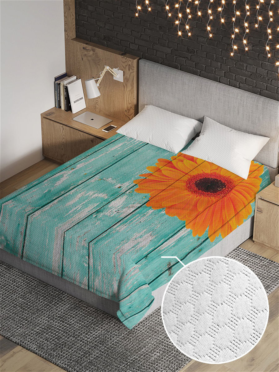 Покрывало-плед из стеганого трикотажа со стежкой \"соты\". Размер: 220x235 см (Евро). Материал: высокотехнологичное трикотажное жаккардовое полотно с прослойкой синтепона. Покрывало \"Цветок на заборе\" - объемное и при этом чрезвычайно легкое по весу. Трехслойное покрывало состоит из двух внешних жаккардовых слоев и внутреннего, утепленного нитками синтепона, что делает его \"дышащим\" и теплым, позволяя использовать как одеяло. Покрывало не мнется, имеет высокую износостойкость и долговечность. Рельефная стежка придает элегантность.Покрывало прекрасно ложиться на кровать, равномерно спадая по бокам, по ощущениям напоминает хлопок.Лицевая часть стеганого покрывала с фотопечатью, оборотная - белая. Изделие шьется на высокотехнологичном японском оборудовании, что гарантируется высокое качество. А яркость и стойкость цвета обеспечивает технология сублимационной фотопечати. Основные цвета: серый,оранжевый,красный. Дизайн: цветок,лепестки,доски,цветок на досках. Состав: полиэстер 100%
