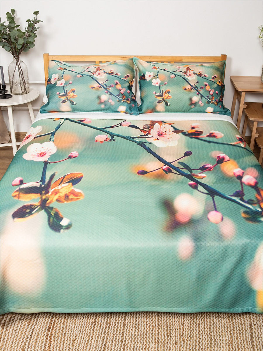 Комплект покрывала с наволочками \"Весеннее цветение\" из стеганого трикотажа с плетением жаккард. Размер Евро: 220x235 см покрывало, 50x70 см наволочки. В комплекте покрывало-плед и 2 наволочки. Материал изделий особо мягкий, \"дышащий\", ощущается как хлопок. Он состоит из трех слоев: два слоя плотной ткани с плетением жаккард, а между ними проложен теплый и легкий гиппоаллергенный тонкий наполнитель из синтепона. Покрывало функциональное, может использоваться как одеяло. Не сползает с кровати, края спадают равномерно, закрывая бока. Стежки \"соты\" создают интересный выпуклый узор, который делает покрывало и наволочки рельефными, придавая особую элегантность. Лицевая часть покрывала и наволочек с фотопечатью, оборотная - белая. Изделия сохранят форму даже после многочисленных стирок. Дизайн: \"почки, цветы, весна\". Цвета: \"розовый, голубой, зеленый\". Состав: полиэстер 100%