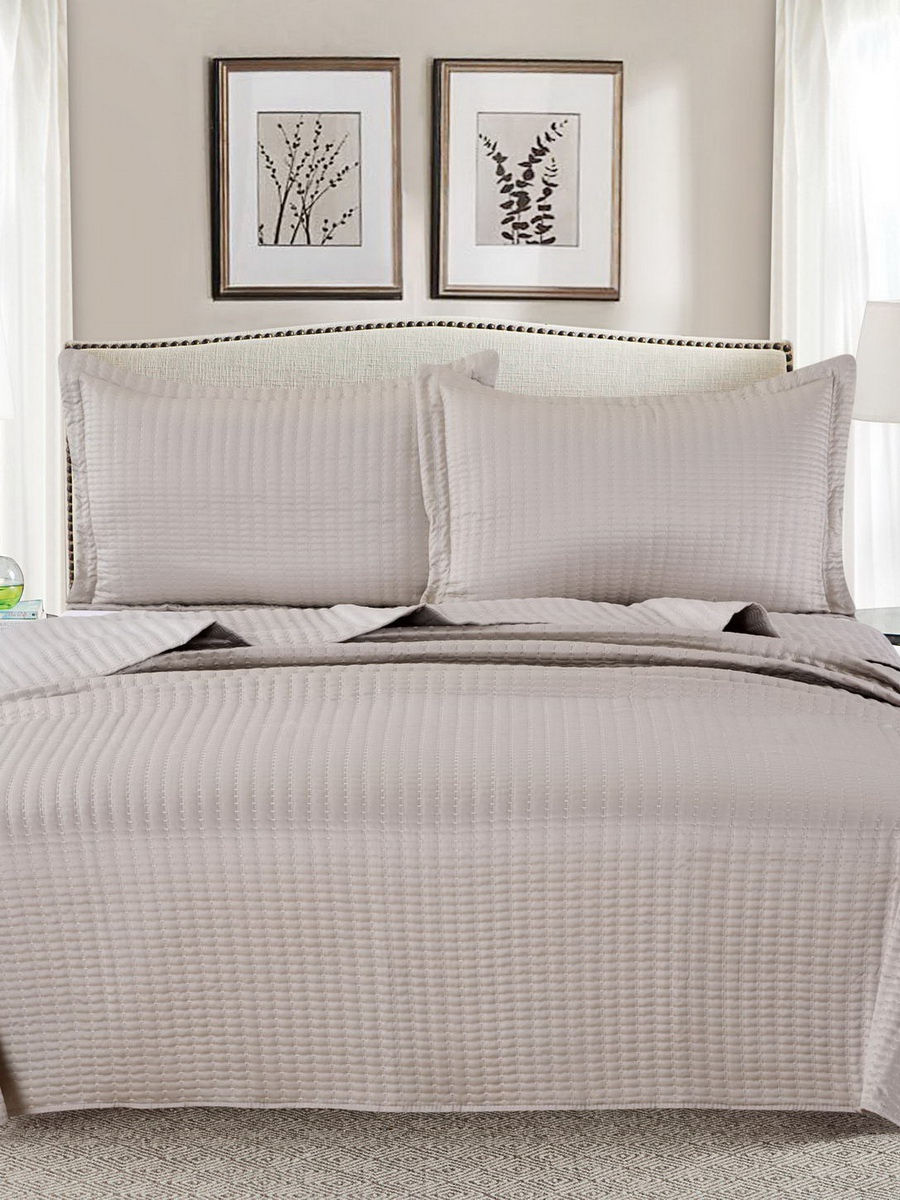 Комплект Микаэлла состоит из стеганого покрывала и двух наволочек, выполнен в светлых пудровых тонах. Рельефная стежка придает изделию изысканный вид. Упаковка : Сумка ПВС с фото. Уход: Стирка при 30 С. Состав: хлопок, вискоза