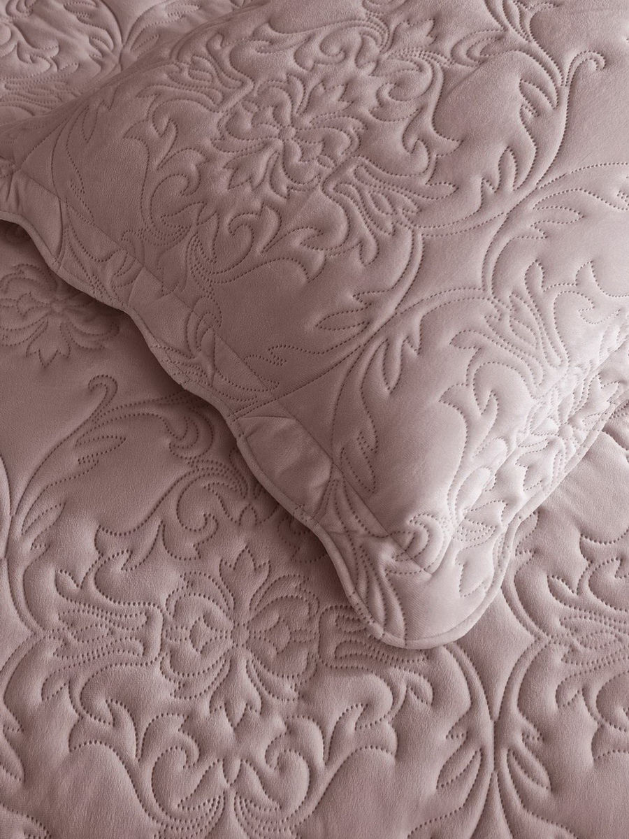 Комплект Амара состоит из велюрового покрывала и наволочки. Выполнен в светлых пудровых тонах. Рельефная термостежка придает изделию изысканный вид. Упаковка : Сумка ПВХ с фото. Уход: Стирка при 30С. Состав: хлопок, вискоза