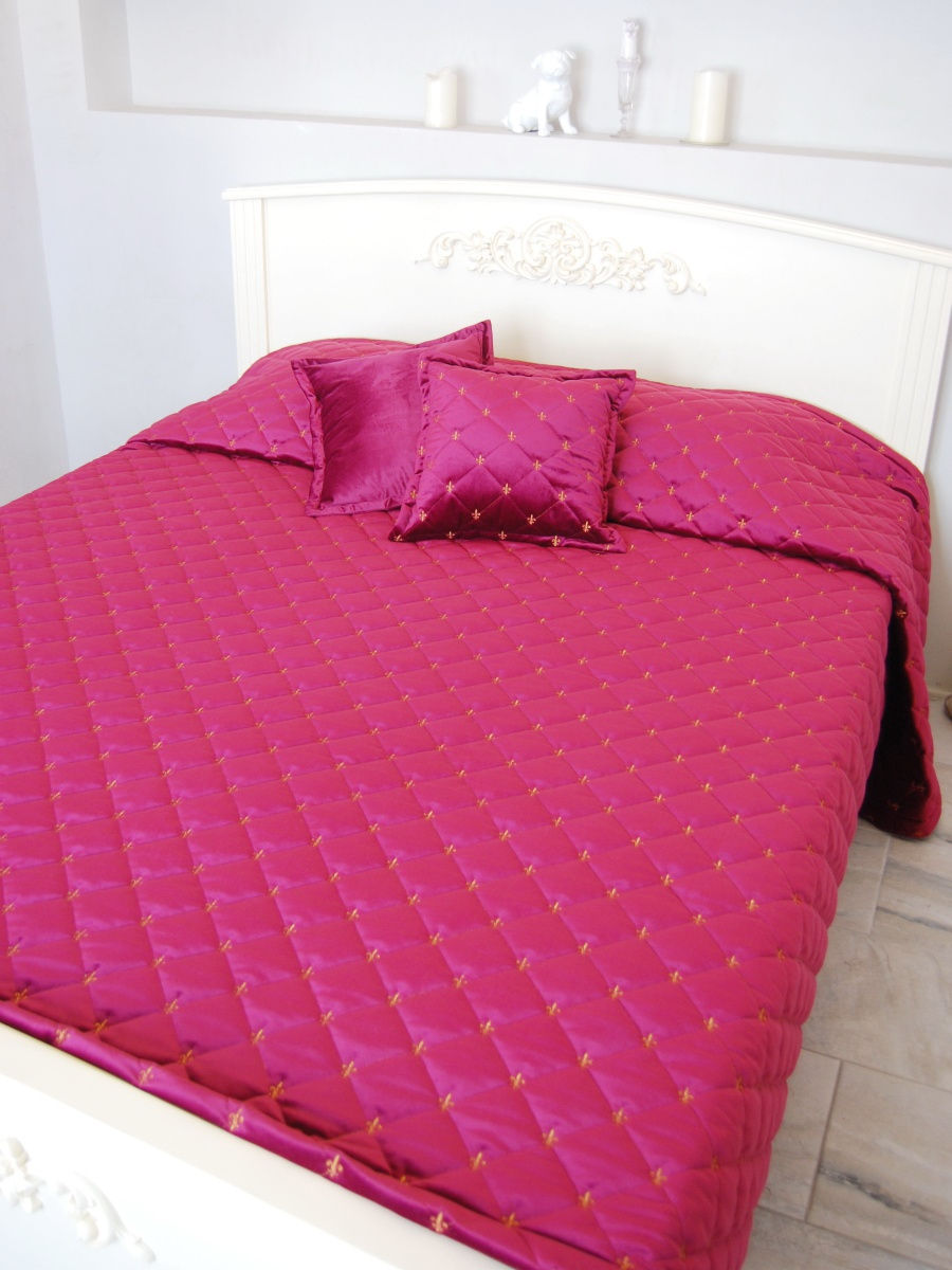 Покрывало бархат-велюр простёгано рисунком \"Французская лилия\" с декоративной вышивкой. Подкладочная ткань - 100% полиэстер.В комплект входят две подушки размером 45х45 см из того же велюра. Наполнитель подушек: упругое полиэфирное волокно. Покрывала, подушки из велюра подлежат ручной и машинной стирке температурой до 40С. Отжим умеренный деликатный, ручной отжим без выкручивания. Сушить на горизонтальной поверхности при комнатной температуре. Глажка только с лицевой стороны температурой до 60С по ворсу, строго в одну сторону, заглаживая неровности ворса. Состав: полиэстер 100%