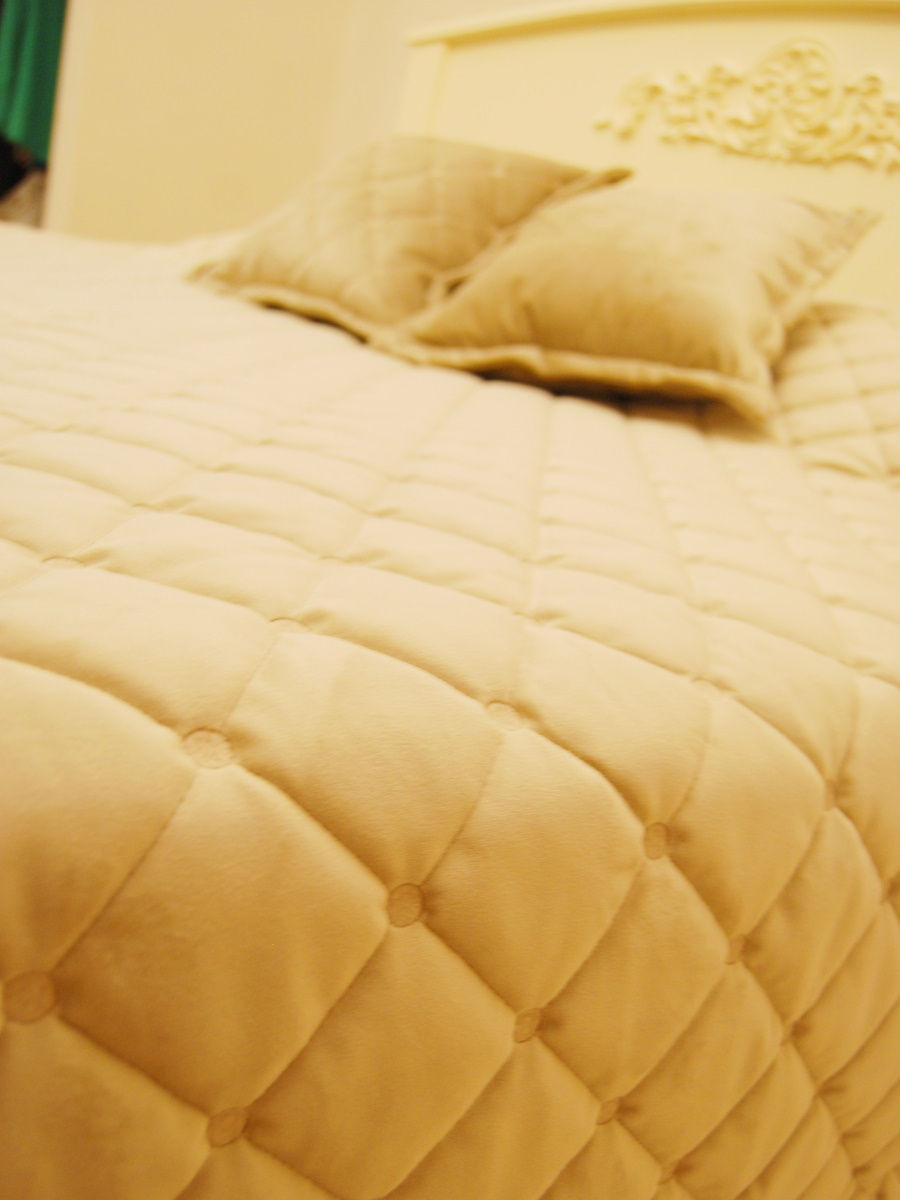 Покрывало бархат-велюр простёгано рисунком ромб с декоративной вышивкой. Подкладочная ткань - 100% полиэстер. В комплект входят две подушки размером 45х45 см из того же велюра. Наполнитель подушек: упругое полиэфирное волокно. Покрывала, подушки из велюра подлежат ручной и машинной стирке температурой до 40С. Отжим умеренный деликатный, ручной отжим без выкручивания. Сушить на горизонтальной поверхности при комнатной температуре. Глажка только с лицевой стороны температурой до 60С по ворсу, строго в одну сторону, заглаживая неровности ворса. Покрывало размера 220х200 см рассчитано для кровати 200x160 см и 200x140 см. Состав: искусственный велюр 100%