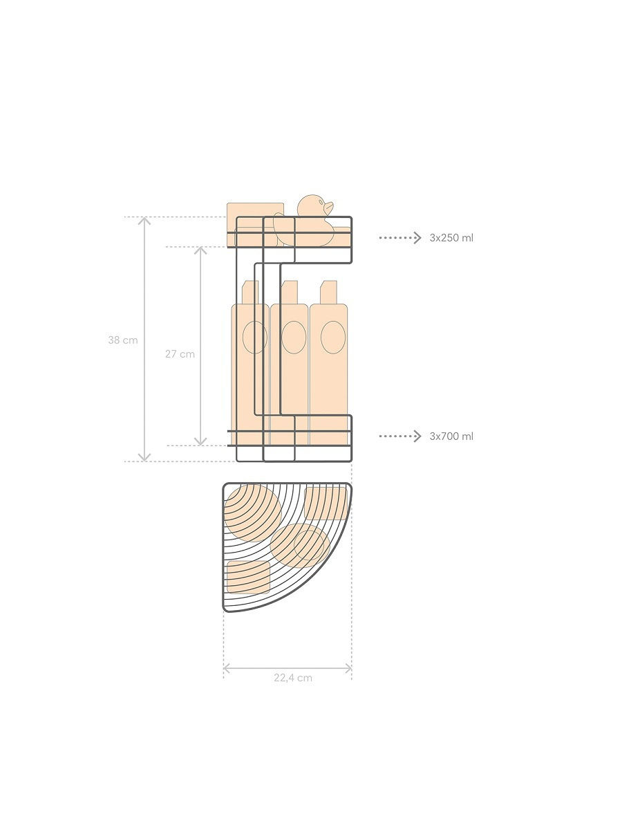 Двухъярусная угловая полка из стали с гальваническим покрытием цвета хром. Идёт в комплекте с шурупами из нержавеющей стали. Размеры изделия: высота 38 см, длина 22,4 см, ширина 22,4 см. Увеличенный промежуток между ярусами в 27 см позволяет разместить высокие бутылочки. Гальваническое покрытие обеспечивает повышенную стойкость к коррозии, благодаря чему полка прослужит долго. Покрытие обладает повышенной стойкостью к щелочам, входящим в состав косметических средств и бытовой химии. Надежный крепёж выдерживает большую нагрузку. Изделие долго сохраняет первозданный вид. Аккуратно обработанные края и швы облегчают уход. Вместительные полки позволяют разместить разнообразные предметы, как крупного, так и мелкого размера. Высокий бортик препятствует выпадению содержимого. Дно из проволоки не удерживает жидкость. Цвет хром - универсальный, что позволяет вписать изделие в интерьер любой ванной комнаты.