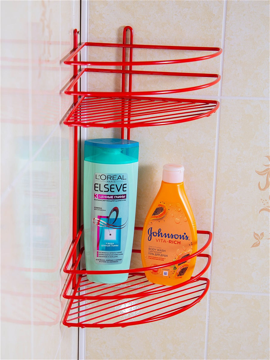 Полка угловая 2-ярусная, форма-овал, высокая, Красная, выполнена из стали и покрыта специальным, влагозащитным полимерным покрытием, что увеличивает срок службы изделия. Организует пространство, а также подчеркнет стиль любой ванной комнаты или кухни. В комплекте крепеж. Размеры: 200х200х380 мм.