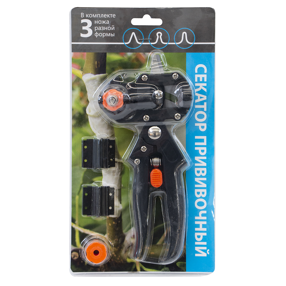 Секатор используется для фигурных срезов на ветках при прививочных работах. В комплекте три ножа разной формы.