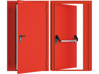 Противопожарные двустворчатые двери отличаются высокими эксплуатационными характеристиками, надежностью и долговечностью. Они предназначены для сдерживания распространения огня и продуктов горения. По периметру двери устанавливается термоактивная лента, которая при возрастании температуры увеличивается в объеме и герметизирует проем. В качестве наполнителя полотна используется негорючая минераловатная плита высокой плотности. Сфера применения: в торговых павильонах, в кабинетах школ, больниц, детских садов и т. д.