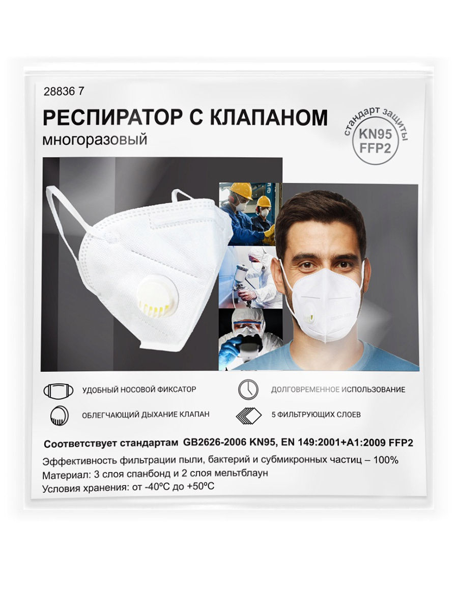 Респиратор с клапаном типа FFP2 / KN95 (соответствует европейскому CE FFP2 и американскому стандарту FDA N95) предназначен для защиты органов дыхания от опасных частиц, таких как различные аэрозоли, бактерии, микробы, вирусы или споры. Он состоит из 5 слоев и способен задерживать 95% частиц, поэтому станет отличным помощником во время вирусных эпидемий, при контакте с токсичными аэрозолями или выполнении работ, требующих специальной защиты. Конструкция клапана позволяет выводить влагу и максимально снизить уровень влажности внутри респиратора, оставляя его эффективным на протяжении многих часов использования. Респиратор имеет встроенный регулируемый зажим для носа, что делает носку комфортным. Респиратор предназначен для многоразового использования, при соблюдении требований использования и хранения.