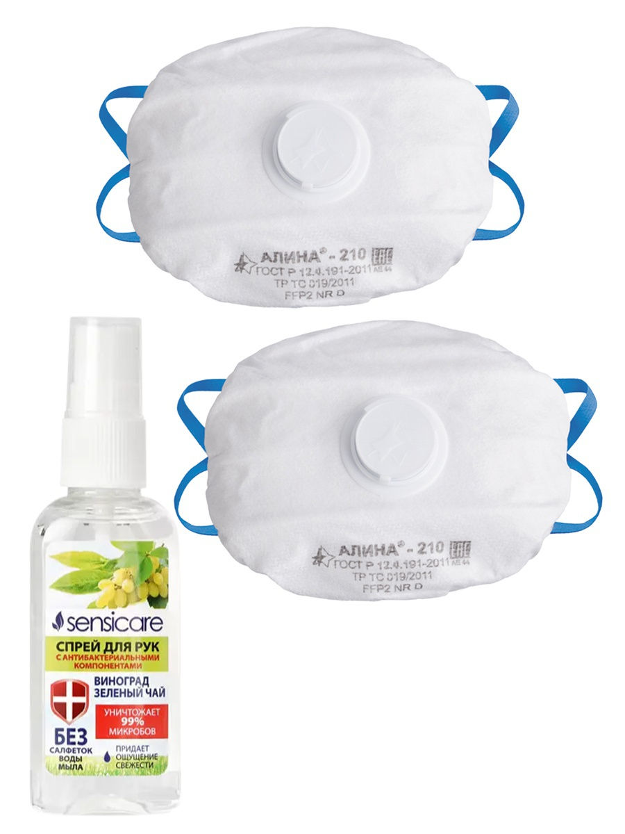 Набор респираторов Алина 210 3 шт. и спрей-антисептик Sensicare . Класс защиты респиратора: FFP2 Неформованый респиратор универсального размера из нетканого фильтрующего материала. Антисептик-спрей Sensicare ,объем 50 мл. эффективно дезинфицирует,освежает и смягчает кожу рук. Обладает приятным запахом винограда и зеленого чая. Спрей удобен в использовании и незаменим в дороге,на природе и в местах общего пользования.