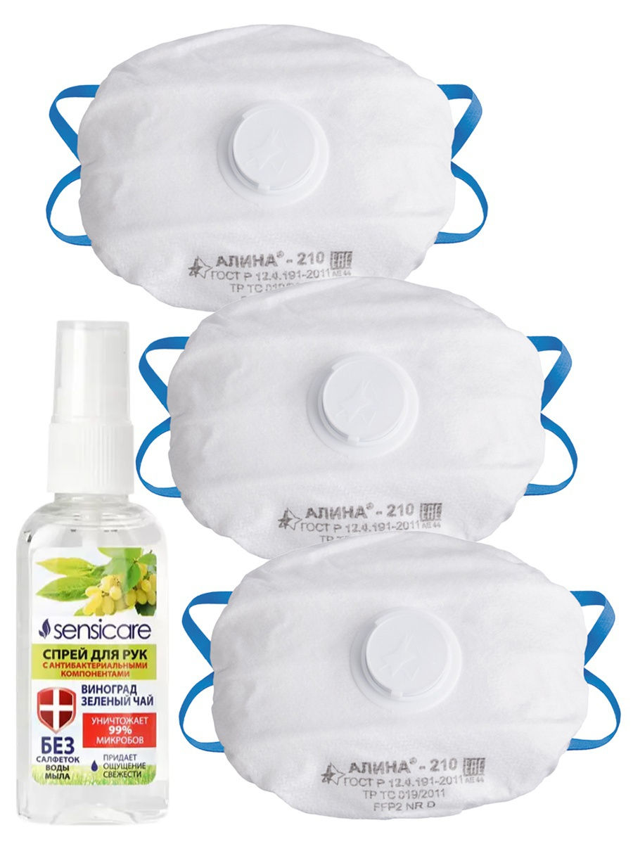 Набор респираторов Алина 210 3 шт. и спрей-антисептик Sensicare . Класс защиты респиратора: FFP2 Неформованый респиратор универсального размера из нетканого фильтрующего материала. Антисептик-спрей Sensicare ,объем 50 мл. эффективно дезинфицирует,освежает и смягчает кожу рук. Обладает приятным запахом винограда и зеленого чая. Спрей удобен в использовании и незаменим в дороге,на природе и в местах общего пользования.