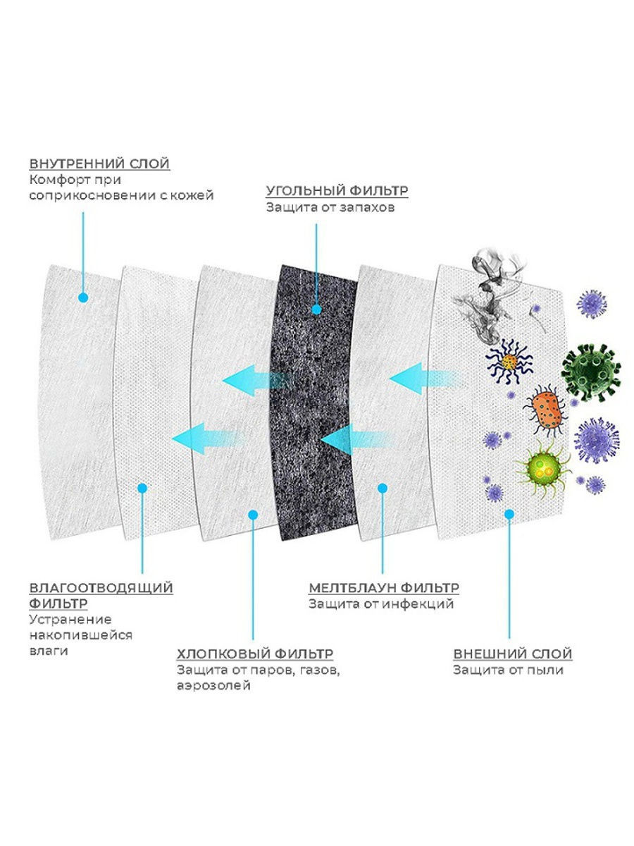 Респиратор является практичным средством индивидуальной защиты. Несколько слоев прекрасно очищают вдыхаемый воздух. На маске имеется гибкая \"скоба\" для фиксации на носу и обеспечения максимального прилегания. Специальная конструкция обеспечивает плотное прилегание маски к лицу, большая поверхность фильтрующего материала способствует качественной очистке воздуха, контактирующие с кожей материалы гигиеничны, маска изготовлена из гипоаллергенного материала.