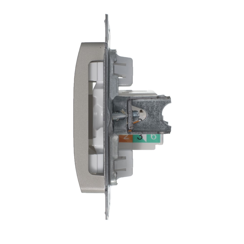 Розетка RJ45 кат.5E Glossa Schneider Electric (Глосса Шнайдер Электрик) GSL001281K. Неэкранированная компьютерная розетка RJ45, кат.5е устанавливается в телекоммуникационных сетях и служит для подключения к локальным сетям, сети Интернет и для подсоединения внешних устройств (телефон, факс и т.д.). RJ-45 Cat.5е - передает данные для двух пар в пределах 100 Мбит/с., для четырех пар - 1000 Мбит/с. Данный вид розетки, без рамки, позволяет установить его совместно с другими розетками или выключателями данной модели под одну совместную рамку, которая приобретается отдельно.