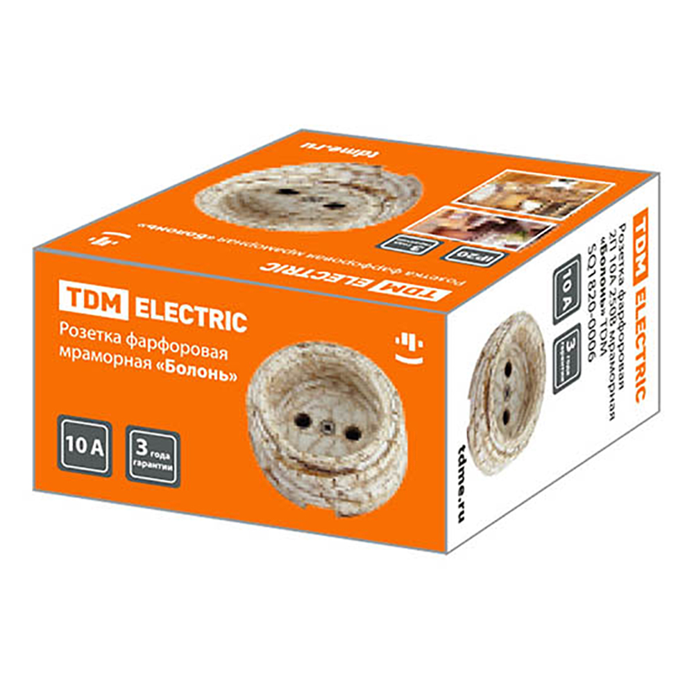 Розетка накладная Болонь SQ1820-0006 (ТДМ ЭЛЕКТРИК). Материалы: Круглое основание – фарфор. Внутренняя часть розетки – негорючий пластик. Винтовое соединение, позволяющее шлейфить; контакты из высокоупругой фосфористой бронзы Номинальный ток: 16 А.