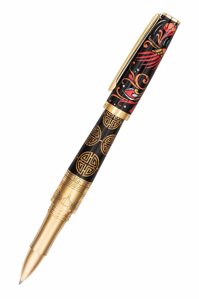 Ручка посвящена теме исторических и культурных связей России и Китая. На колпачке ручки, выполненном в технике мозаичной эмали, изображена Жар-птица, а тело ручки украшено гравировкой в виде китайского иероглифа Лу – символа благополучия и богатства. На серебряном позолоченном ободке ручки выгравированы изображения куполов и элементы кремлевской стены над ними, а напротив - изображения китайских пагод и элементов Великой китайской стены.