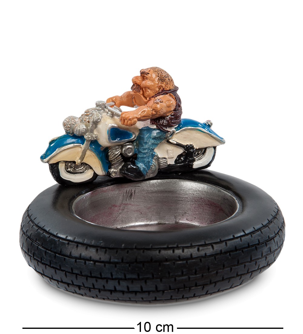Необычная пепельница из полистоуна диаметром 10 см. Пепельница в подарок заядлому "гонщику" - красивый и функциональный подарок. Руководитель, обладающий собственным кабинетом, вряд ли решится поставить на своем рабочем столе явное упоминание о своем увлечении – мотоцикле, который он сам доводит до вершин мощности и красоты. Поэтому подарок в виде пепельницы, выполненной в виде автомобильного колеса и украшенной фигуркой байкера на мотоцикле, явно придется ему по вкусу. Это уже не бесполезная статуэтка, а необходимая вещь, да и о любимом мотоцикле позволяющая вспоминать. Подобные мужские статуэтки получать в подарок приятно всем. Даже если ваш начальник не курит, пепельницу он вполне может держать в своем кабинете для гостей и при необходимости предлагать ее посетителям.