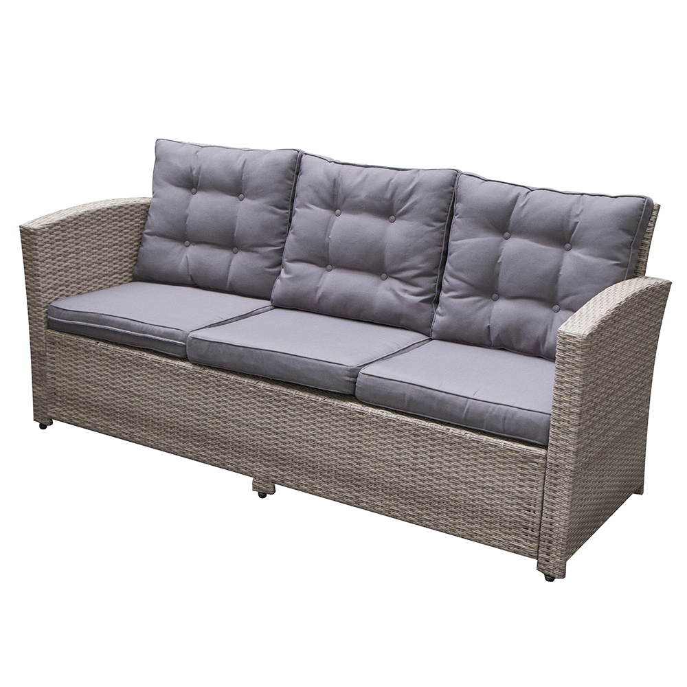 Набор мебели Орландо DB-121KD-17-L подойдет для использования снаружи и внутри помещения. Каркас выполнен из металла, оплетка из искусственного ротанга. Диван и кресла дополнены мягкими подушками. Материал чехлов устойчивы к действию неблагоприятных атмосферных явлений и ультрафиолетовых лучей. Стол комплектуется столешницей из закаленного стекла толщиной 5 мм. Набор поставляется компактно упакованным в прочный картон. Технические характеристики: Материал чехлов: полиэфир плотностью 230 г/м2. Размеры кресла (ШxВxД): 73x87x74 см. Размеры стола (ШxВxД): 84x64x145 см. Размеры дивана (ШxВxД): 73x87x185 см. Максимальная нагрузка: 90 кг на одно посадочное место. Размер упаковки: 172х87х81 см.