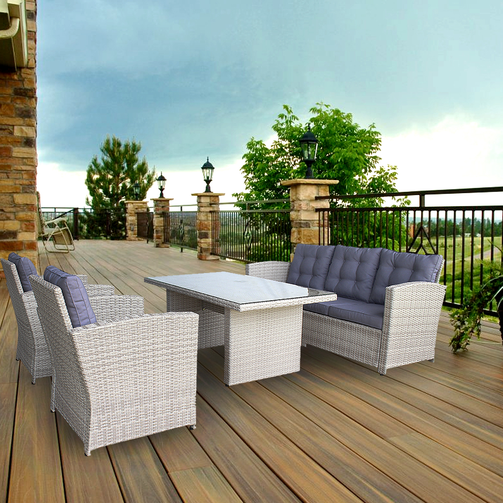 Комплект садовой мебели состоит из четырех предметов: диван, два кресла и стол. Рассчитан на пять человек.