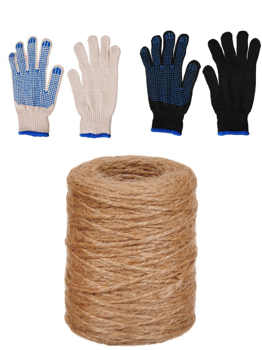 Набор содержит две пары перчаток белую и черную и шпагат джутовый. Состав: хлопок, джут