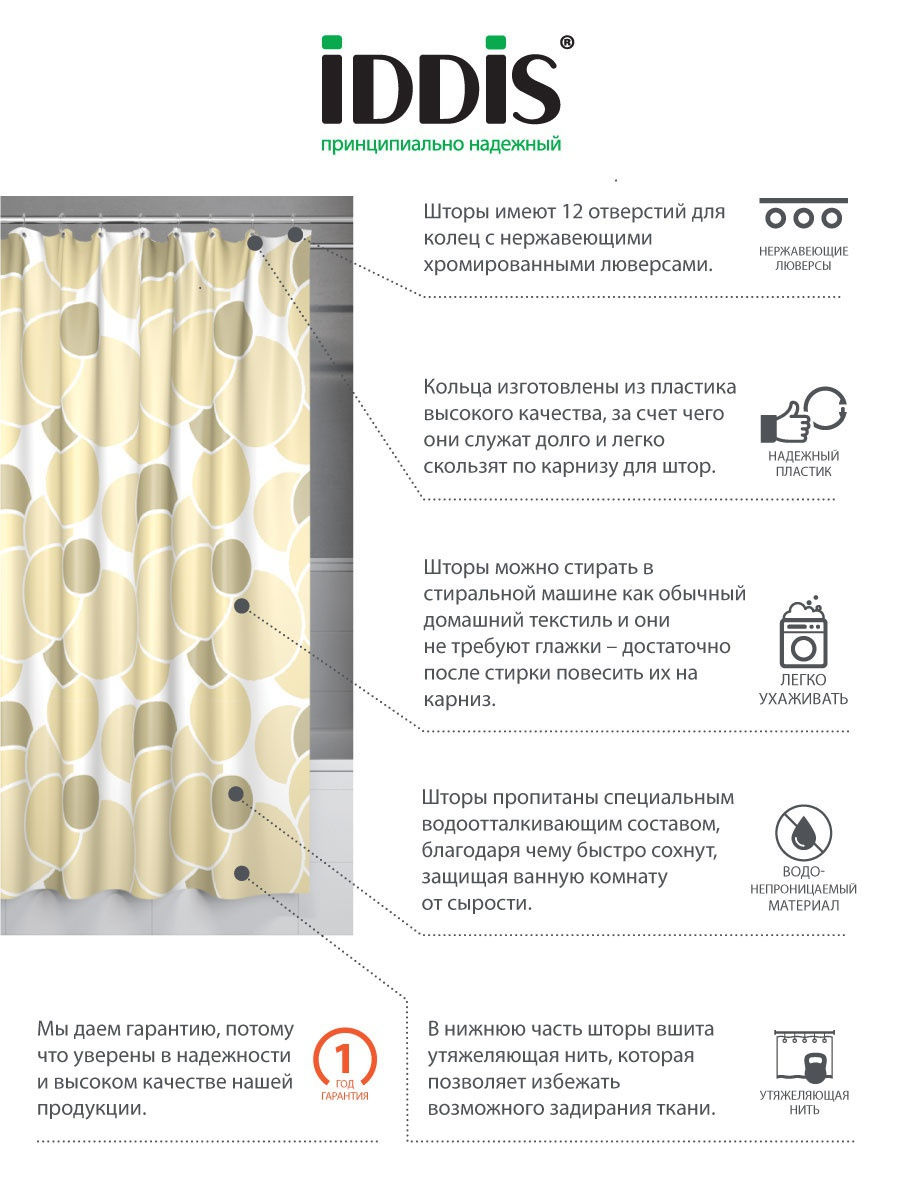 Данная штора имеет XL РАЗМЕР - 200х240 см! Шторы для ванной комнаты IDDIS выполнены из быстросохнущего материала - 100% полиэстера, что обеспечивает их прочность и делает более простыми в уходе. В комплект входит 12 прозрачных колец с системой Click, которая обеспечивает их быстрое и легкое открытие и надежное крепление шторы на карнизе. Материал, из которого изготавливаются шторы IDDIS, пропитан специальным водоотталкивающим составом Waterproof, что обеспечивает их исключительную водонепроницаемость. Нижняя часть шторы имеет утяжеляющую нить, благодаря которой штора самостоятельно расправляется и не сминается, приобретая аккуратный и эстетичный вид. Штора IDDIS оснащена 12 отверстиями с металлическими хромированными люверсами для колец, которые не ржавеют и сохраняют эстетический внешний вид в течение всего срока эксплуатации. Штору можно стирать в стиральной машине. Отжимать и гладить не рекомендуется. Гарантия на шторы IDDIS составляет 1 год.