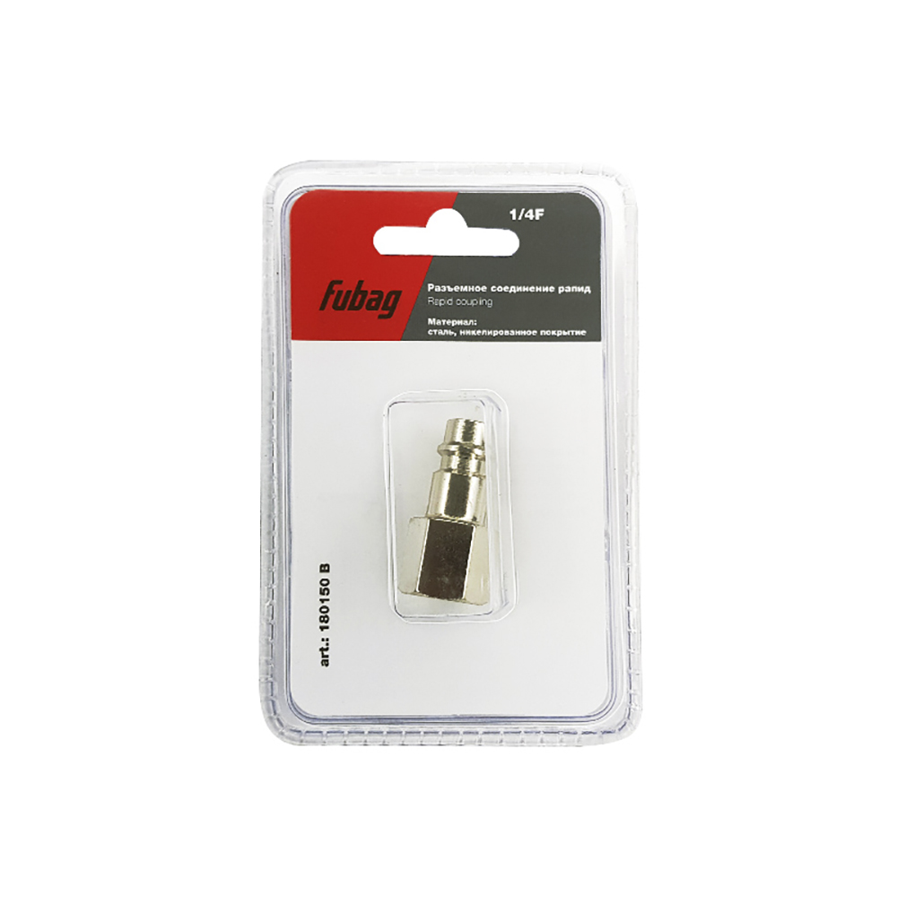 Соединительный штуцер Fubag (Фубаг) 180150 B используется для надежного и герметичного соединения частей пневмомагистрали. Характеристики: Переход: быстросъемное соединение рапид папа - внутренняя резьба 1/4' (мама). Материал: сталь, никелированное покрытие.