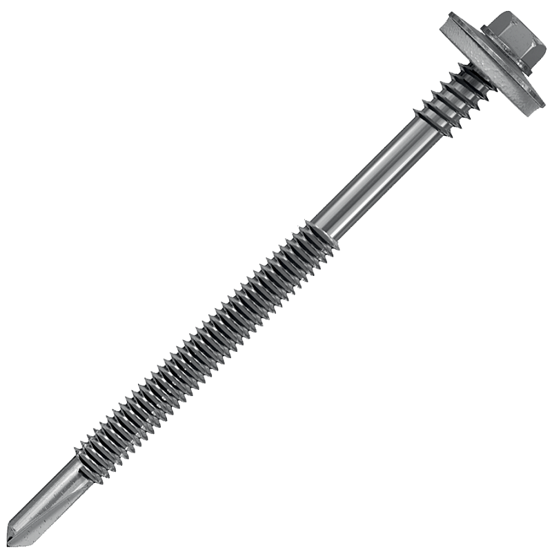 Шурупы для сэндвич-панелей, сталь SAE 1022, антикоррозийное покрытие «Ruspert», шайба из нержавеющей стали AISI 304 с EPDM прокладкой. Преимущества использования саморезов: сокращение сроков монтажа. Саморезы позволяют осуществить крепление панелей без предварительного рассверливания отверстия, что ускоряет процесс монтажа. Возможность работы с различными материалами. Данный вид крепежного изделия используется для фиксации деревянных, металлических, пластиковых, гипсокартонных или гипсоволокнистых конструкций в строительстве, ремонте, при производстве мебели или отделки. Надежная фиксация элементов. Сталь, из которой изготавливаются саморезы для сэндвич панелей, обладает повышенной прочностью. Дополнительная резьба увеличенного диаметра под головкой обеспечивает надежное крепление к различным основаниям. Обеспечение полной герметизации в точке крепления. Специальная уплотнительная шайба предотвращает проникновение влаги и позволяет сохранять герметизацию в месте расположения отверстия даже при монтаже под углом 15°. Толщина скрепляемых материалов 85-120 мм.