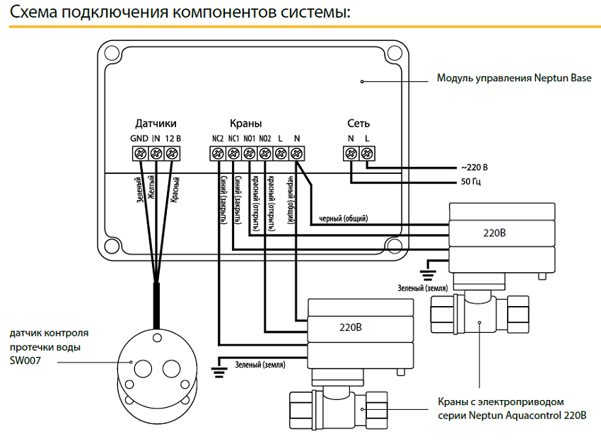 Система контроля протечки воды Neptun Aquacontrol предназначена для своевременного обнаружения и локализации протечек воды в системе водоснабжения и отопления жилых домов, коттеджей, офисных зданий, магазинов. Система заблокирует подачу воды до устранения причин протечки и проинформирует о возникшей аварии звуковым и световым сигналами. При попадании воды на любой из датчиков, подключенных к модулю управления, управляющее напряжение подается на краны шаровые с электроприводом, подключенные к этому же модулю, которые заблокируют подачу воды. Контроль протечки воды осуществляется автоматически и не требует участия пользователя. Функции системы контроля протечки воды Neptun Aquacontrol: контроль протечки воды; автоматическая блокировка водоснабжения при срабатывании любого датчика; звуковая и световая сигнализация аварийного состояния; запоминание состояния аварии до устранения ее последствий. Комплектация: модуль управления Neptun Base - 1 шт.; краны шаровые с электроприводом Neptun Aquacontrol - 2 шт.; датчики контроля протечки воды SW007 - 2 шт., длина 2 метра (возможно нарастить до 100 м).