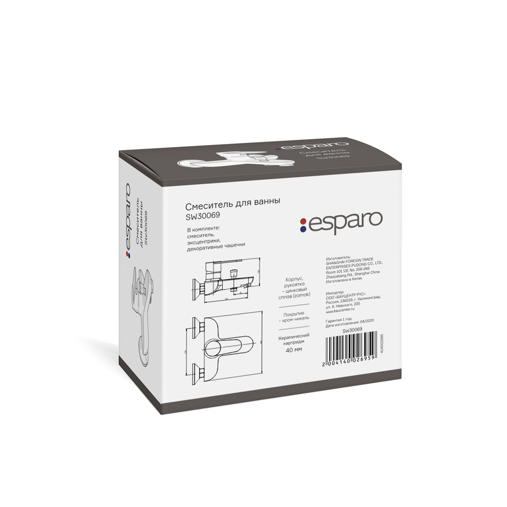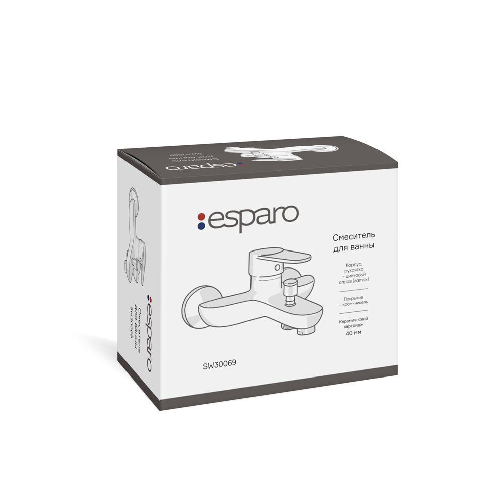 Смеситель для ванны Esparo (Эспаро) SW30069 оснащен керамическим картриджем. Корпус и рукоятка смесителя изготовлены из цинкового сплава. Пластиковый аэратор насыщает водную струю воздухом, что делает ее мягкой и снижает количество брызг.