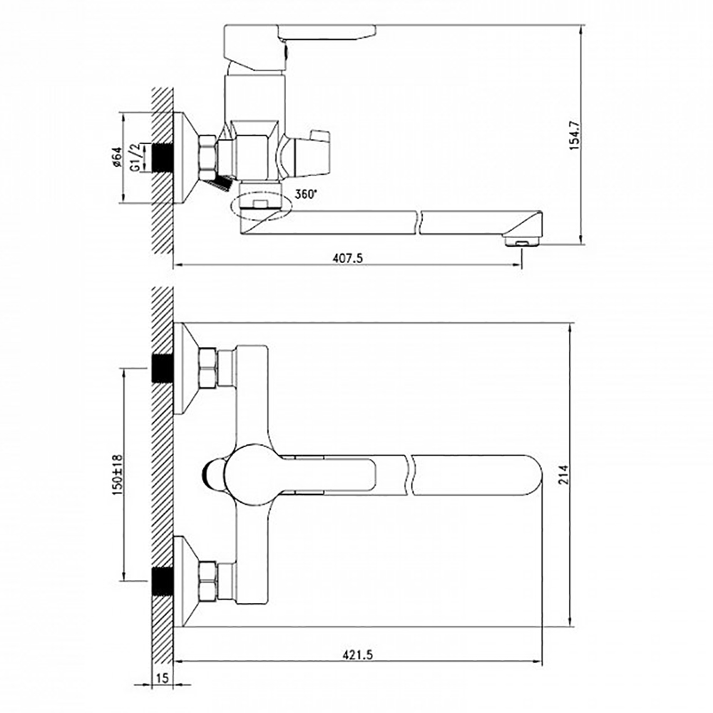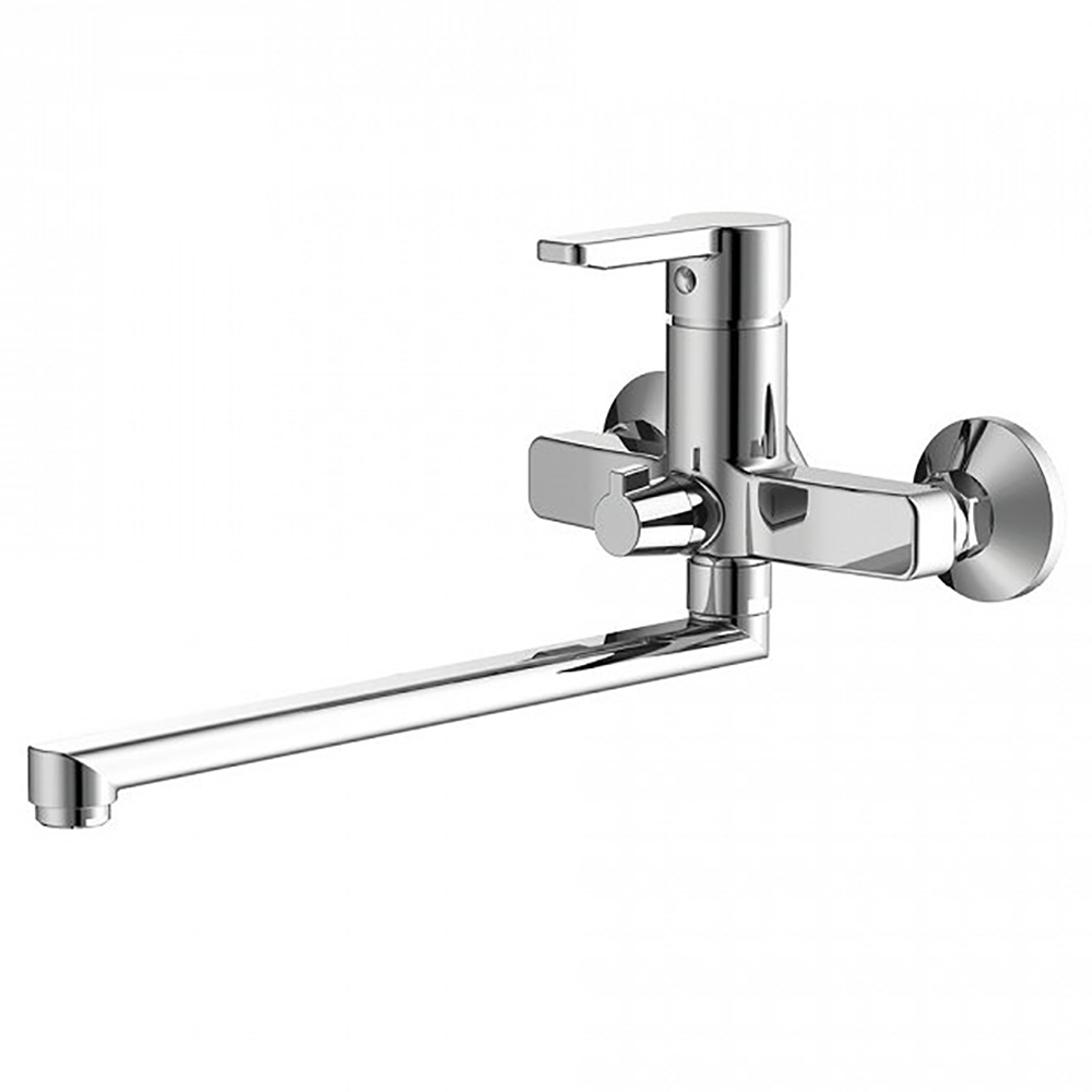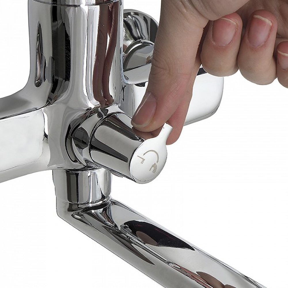 Однорычажный смеситель с длинным изливом и флажковым дивертором для ванны и душа.