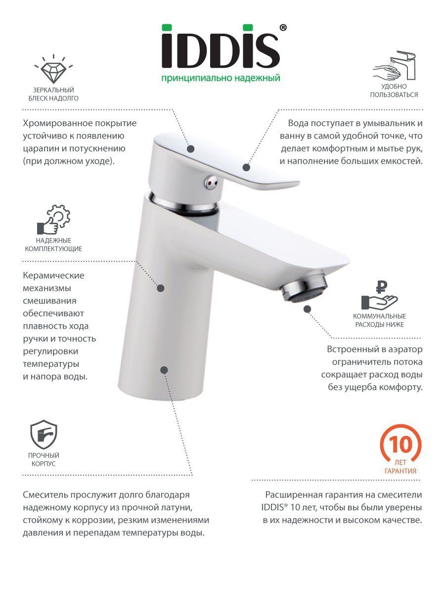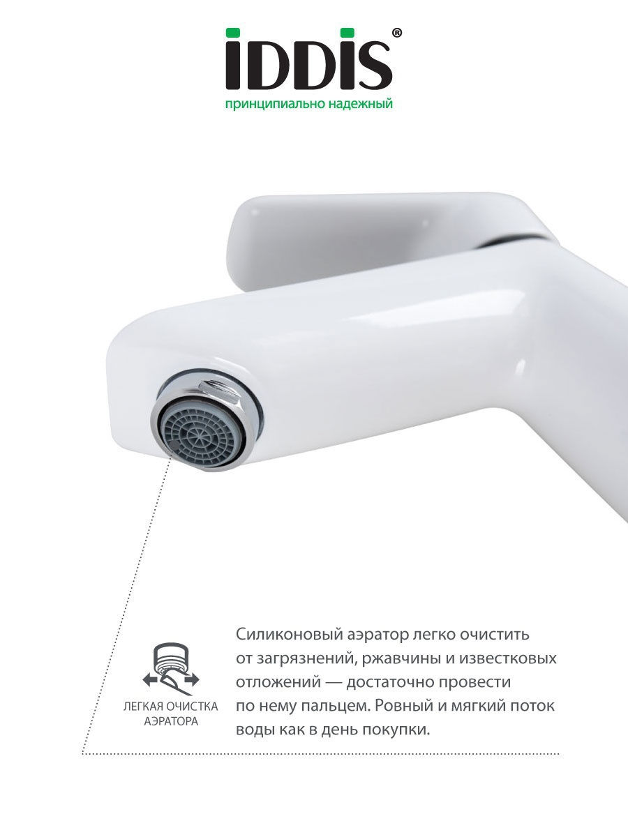Компактный однозахватный смеситель для умывальника из коллекции Cloud. Сочетание белого цвета и хрома подойдет к интерьеру в современном стиле. Максимальный расход воды - 14 л/мин. В комплекте гибкая подводка и крепеж. Смеситель прослужит долго благодаря надежному корпусу из прочной латуни, стойкому к коррозии, резким изменениями давления и перепадам температуры воды. Хромированное покрытие устойчиво к появлению царапин и потускнению (при должном уходе). На протяжении многих лет смеситель будет выглядеть как новый. Керамические механизмы смешивания обеспечивают непревзойденную плавность хода ручки и абсолютную точность регулировки температуры и напора воды. Аэратор из прочного элатичного силикона создает ровный и мягкий поток воды без брызг и легко очищается от загрязнений, ржавчины и известковых отложений - достаточно провести по нему пальцем. Расширенная гарантия на смесители IDDIS 10 лет, чтобы вы были уверены в их надежности и высоком качестве. Состав: латунь 100%
