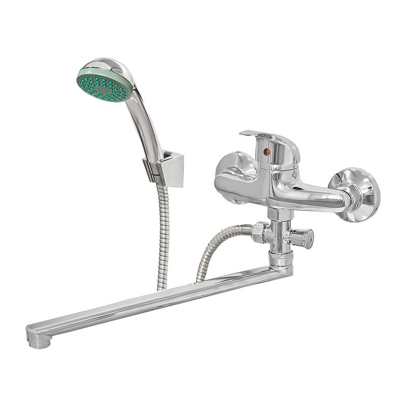 Сделан из силумина (сплав алюминия с цинком). Однозахватный смеситель с наружным кнопочным дивертором. Смеситель оснащён аэратором с пластиковым сердечником. При использовании аэратор обеспечивают ровный поток воды. Поворотный излив изготовлен из нержавеющей стали. В комплект смесителя входит лейка для душа, шланг и кронштейн.