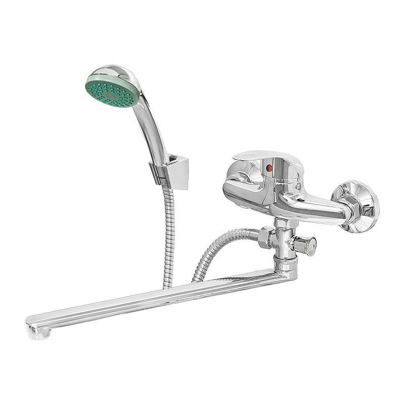 Сделан из силумина (сплав алюминия с цинком). Однозахватный смеситель с наружным кнопочным дивертором. Смеситель оснащён аэратором с пластиковым сердечником. При использовании аэратор обеспечивают ровный поток воды. Поворотный излив изготовлен из нержавеющей стали. В комплект смесителя входит лейка для душа, шланг и кронштейн.