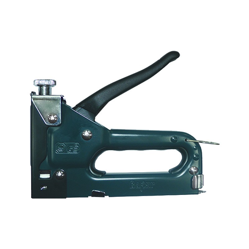 Ударопрочный металлический корпус. Эргономичная обрезиненная ручка. Оснащен винтом, регулирующим силу удара. Окно для контроля заряда магазина скобами. В комплект входят П-образные скобы, тип 53, 8 мм, - 50 шт.