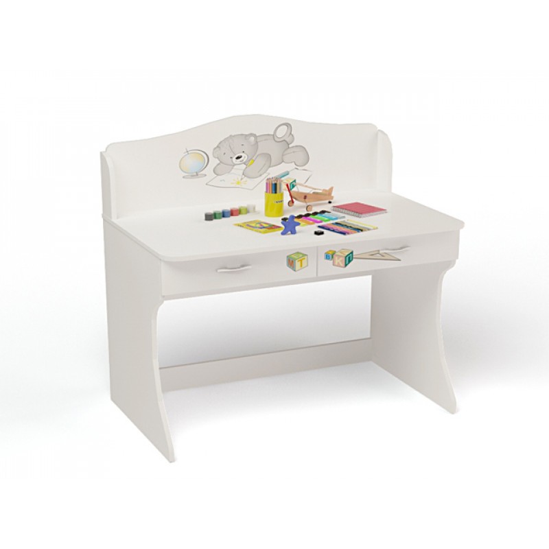 Стол "Мишки" (Bears) без надстройки имеет два выдвижных ящика. В конструкции мебели применяется ДСП немецкого производства, покрытый современными эмалями, благодаря которым за поверхностями мебели легко ухаживать. Для производства используются исключительно экологически чистые материалы. Рисунок нанесен акриловыми красками - они не выгорают на солнце и ребенок их никак не отклеит, это безопасный материал.